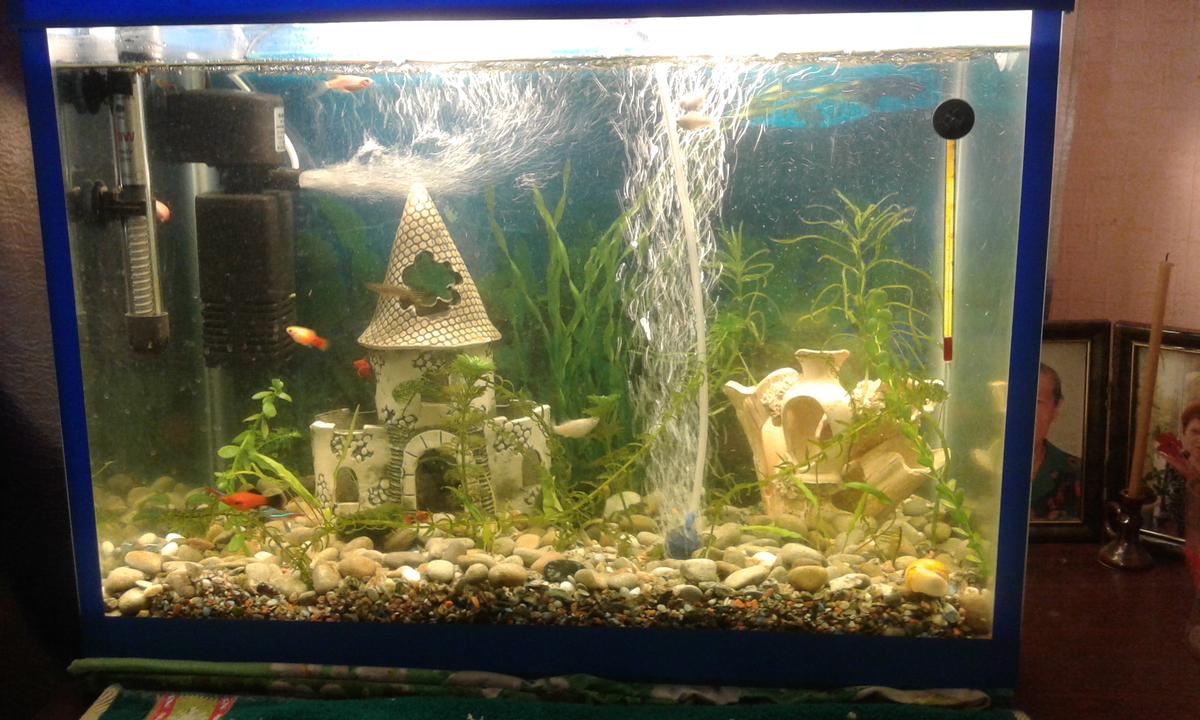 Про аквариум в нем живут молинезии 3шт, пицилии-3шт, меченосцы -3шт, данио 3шт, сом1шт, неон 8шт.