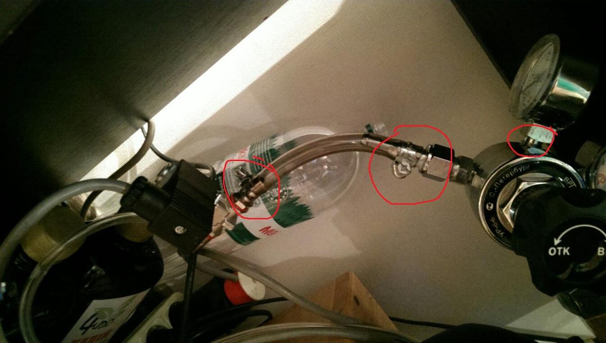Камоззи в том месте откуда выход цо2 в аквариум, опустил в воду,это вышло сделать не намочив электрические части.Тоже нету течи,все проверил все места утечки газа не обнаружил.Запустил систему подаю 1пузырь в 1.5 сек(24 часа).Добавлю фото,все что отметил все проверил,утечек нету.