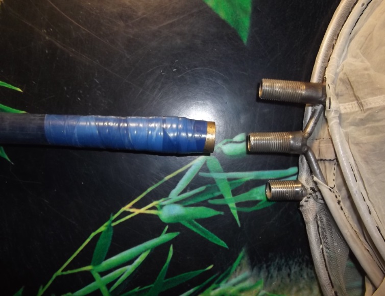 У меня ручка сачка сделана из 3 нижних колен = 3 метра , шестиметровой телескопической удочки . В верхний торец , верхнего(3-го) колена вставлена цилиндрическая латунная втулка диаметром 18 мм , длинной 4 см , с внутренней ресьбой под болт 10-ку . Втулка вклеена во внутрь колена .