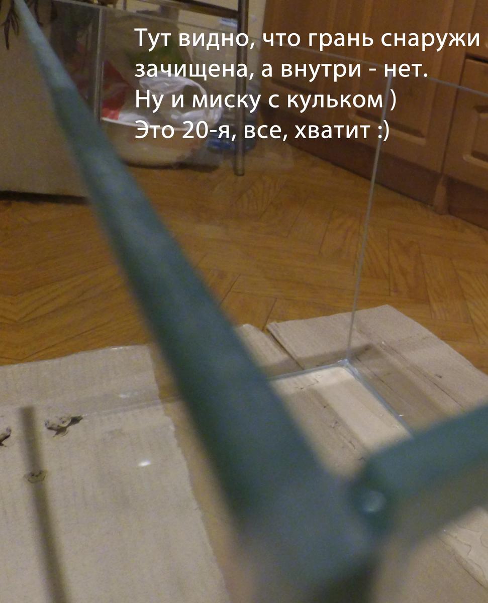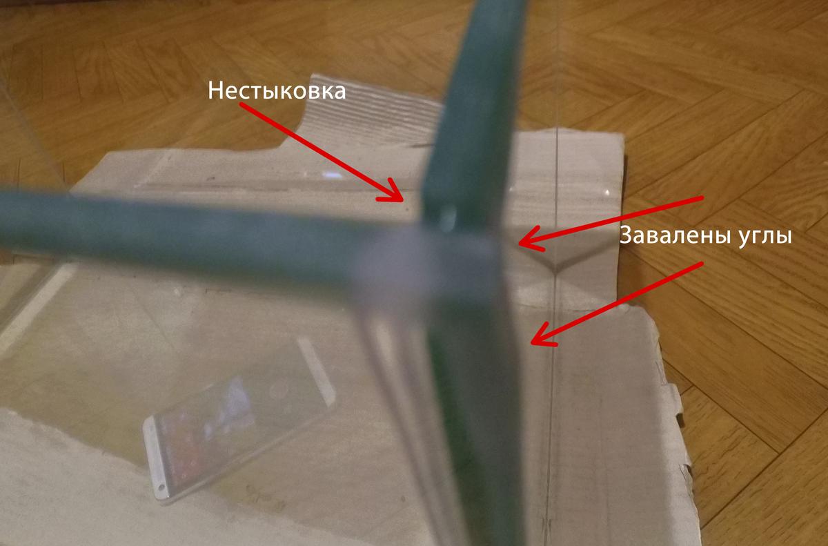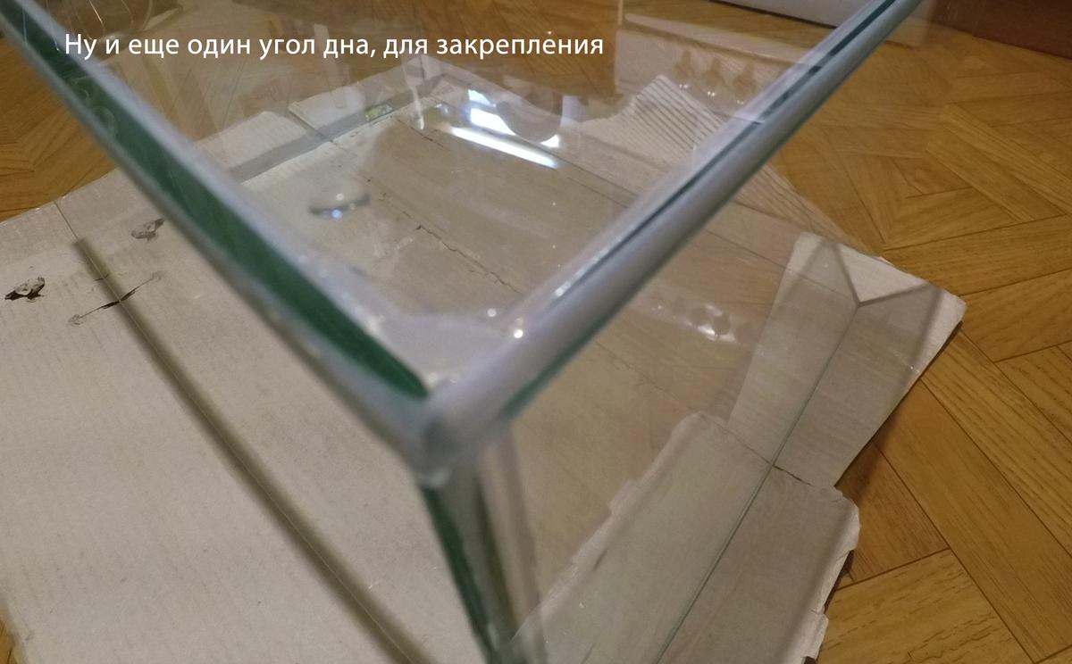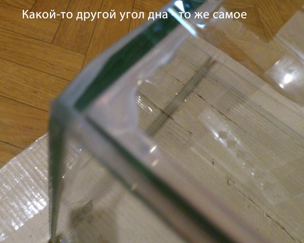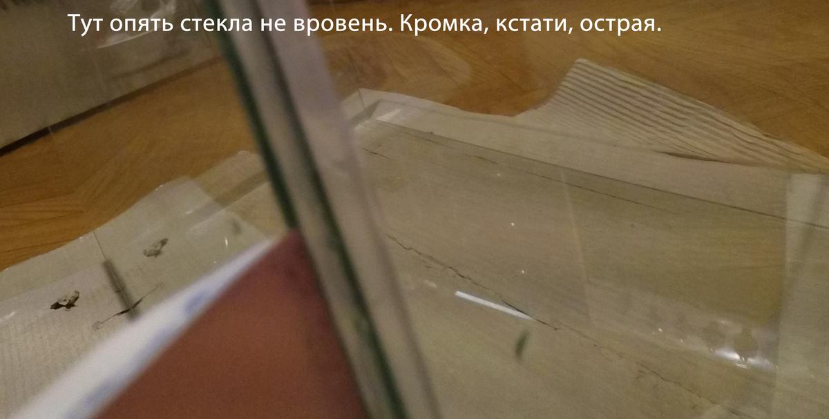 Из за "зализанности" углов стекол углы аквариума при склейке не совпали, до 2 мм где-то. Боковые стекла тоже заклеены не "заподлицо" к боковой грани аквариума, местами ровно, местами стекла "заползли" внутрь до 1-1,5 мм.