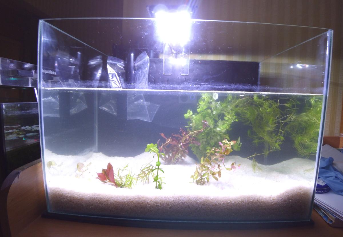 Как-то слишком минорно получилось )) В сборе - вроде нормально. Это сфоткано в три ночи, накидал все, что под рукой было, даже воды не осилил налить до верху, но вид банки с водой, грунтом, фоном, светом позволяет прикинуть.