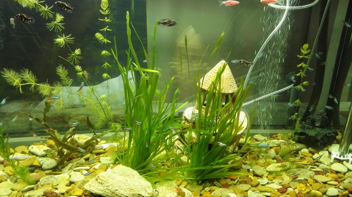 Я вот не пойму,что Вы хотите видеть в данном аквариуме?Растения,рыбу? ...паровозики/водолазики-это аквариум для детей