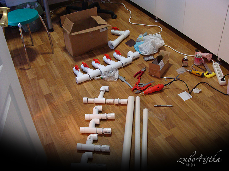 Источников фитингов и труб было 2: местный магазин и интернет-магазин. Нарисовав и распечатав картинки слива и подачи, приложив полный перечень труб и фитингов с указанием количества и интернет-цены, я приперлась в местный бутик. Там мне мужики сказали, что на таком заказе (итоговая цена более 7000грн) они нарисуют цену, гораздо лучше, чем в интернете. Не мотивировав ничем вменяемым, заставили ждать 4 дня их ответа. Когда они позвонили, ВНЕЗАПНО выяснилось, что они готовы со страшной скидкой продать то же самое на тыщу дороже… Закономерно были посланы по известному адресу. Зачем-то обиделись. Открыв интернет-магазин, местный автор с прискорбием обнаружил, что попадает на лишних 500 грн из-за повышения курса уя. Ну что тут скажешь…Берегите, товарищи, ваше время, нервы и деньги.