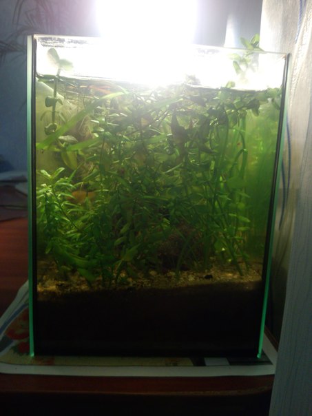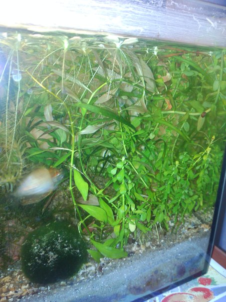 Всем привет) Вот, спустя 1 год и 2 месяца решил написать что же случилось с моим экспериментальным аквариумом на земле) А не случилось с ним ровным счётом ничего ужасного! Ни разу не сифонил, не делал подмены воды (если не считать долив испарившейся воды подменой), фильтр не ставил, воздух не подавал, удо дополнительно не лил. Растения чувствовали себя прекрасно настолько, что бедному гурами негде было плавать и буквально 4 дня назад пришлось отсадить его в запасной аквариум и кардинально проредить землянку, чем поднял кучу песка со дна. Достал камень, кучу валиснерии (она разрослась вдоль боковых стенок, передней и задней, реально получилось, что все кусты валиснерии были сплетены в одну круговую цепочку вокруг аквариума), подстриг людвигию в очередной раз (вылезла на 5 см из воды вертикально вверх), уменьшил количество мха (свет практически не поступал из-за него). Ну и пришлось немного почистить стенки, т.к. аквариум стоит напротив балконного окна и солнечный свет плохо, но попадает на него. Проделал я всю эту работу и оставил банку, чтобы песок осел. Прошла ночь и вода снова стала кристально чистой. Ах да, забыл совсем, вместо камня поставил небольшой домик и в одно из окон вставил анубиас.