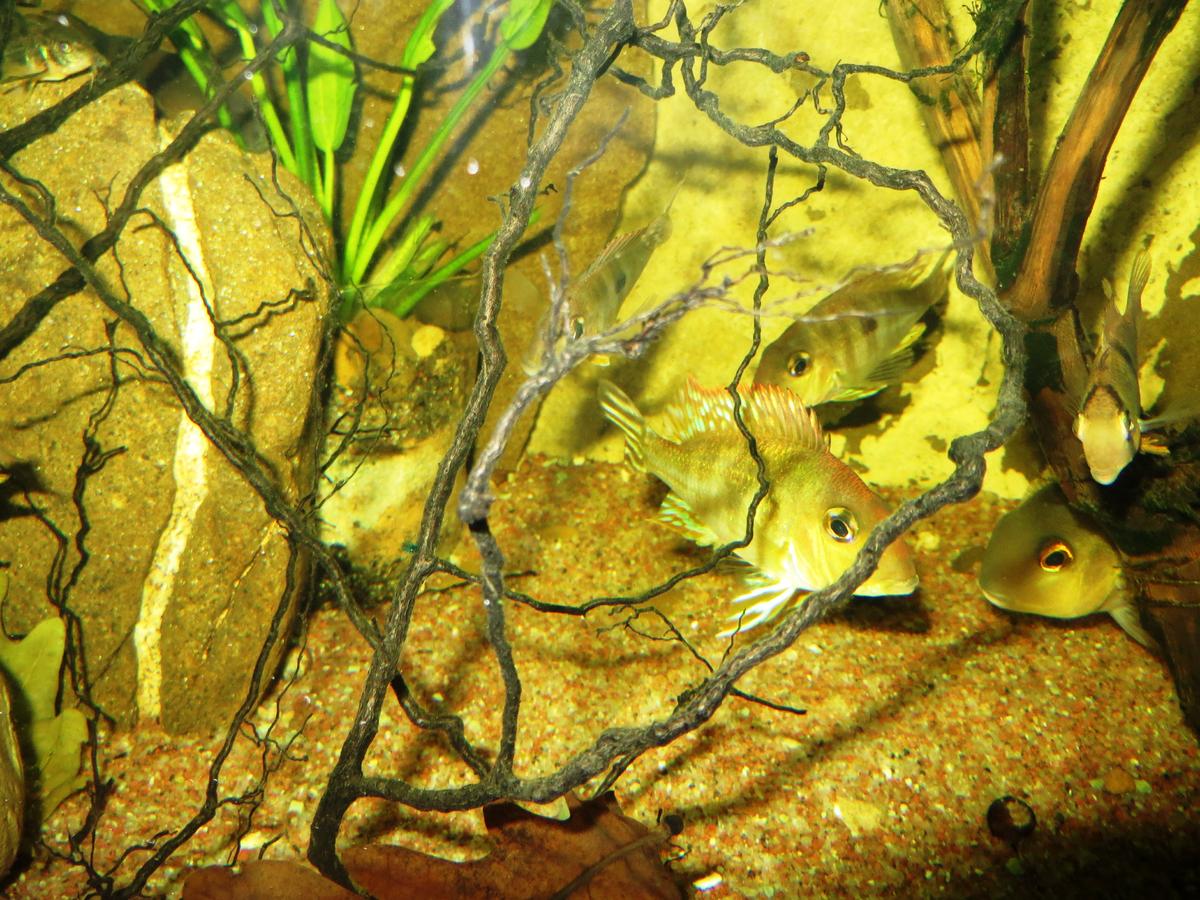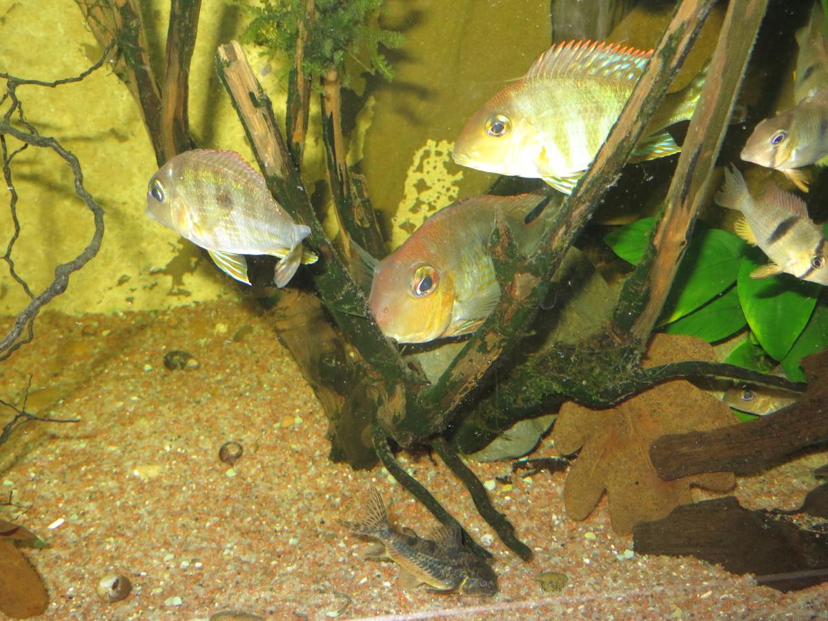 Вот фото моих Топажосов. Приобрел год назад взрослую семью 1+2 и в другом месте подростков 5 шт. Жили все это время в 250 л. В понедельник перевел в 400 л. Постарался сделать нечто похожее на биотоп. С ними вместе малышня Гвианакары Guianacara owroewefi, коридорасы и семья Никарагуанок.