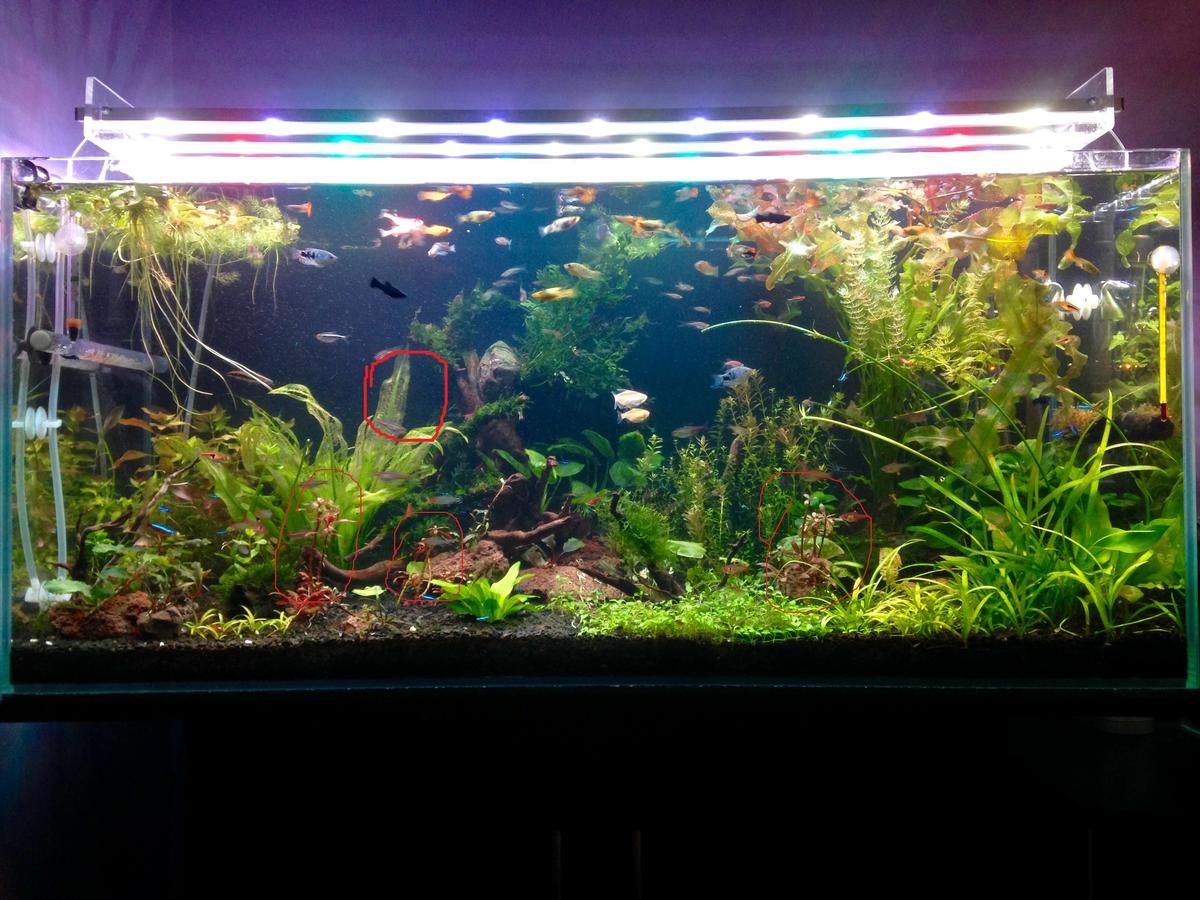 Помогите понять причину! На фото красным выделил растения, которые растут уже пол года, но их внешний вид заставляет желать лучшего... нижние листочки красные, целые и красивые, а в верху сначала покрываются небольшими дырочками, а потом и вовсе отпадают... Остальная растючка буянит, а с этой проблема...