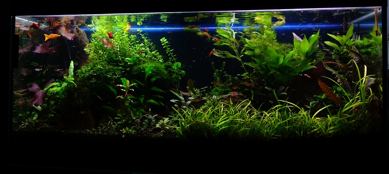 Свет : 90 Вт, из них 60 Вт гролюкс остальное 865 спектр. все лампы T8 по 15 Вт . Грунт : снизу гранит, сверху Fluval stratum. CO2 нет и видимо не будет. длина 100 ширина 31 высота 55. лью калий, микро и железо.