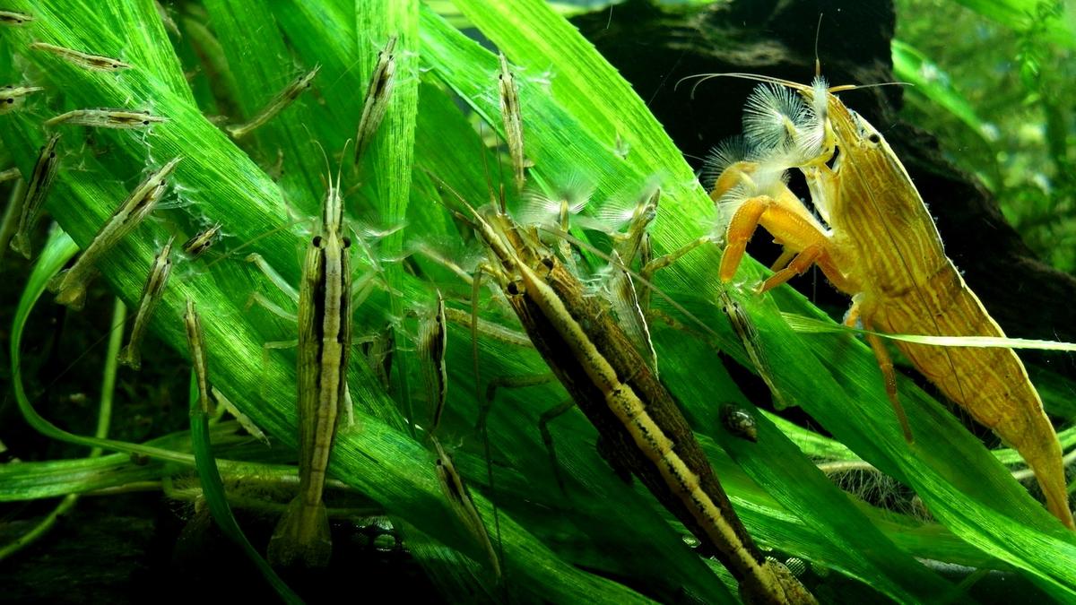 Парочка производителей Atyopsis moluccensis была приобретена именно ради эксперимента с разведением. Поначалу я думал, что купил двух самок и продолбил голову друзьям песней "Хочу мужа". Случайно, как водится, увидел на просвет икру под брюхом одной креветки, а у другой обнаружились внушительные мужские первые ходячие лапы. Немедленно самка была отправлена из общего аквариума в узилище к беременным аманкам.