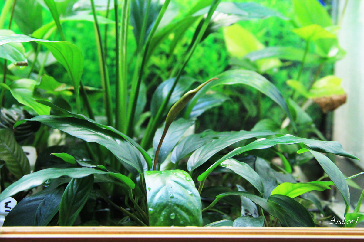 Спатифиллум в тепличке чувствует себя просто отлично.Постоянная высокая влажность,которую так любят данные растения,подчёркивает всю красоту листа.