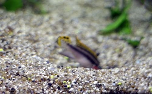 На наступний день він її збільшив вдвоє, то вже була ямище розміром десь 15 на 15 см. Самому геофагу лише десь 7 см і як би зашвидко ще думати про нерест... Що мене здивувало - копав він /стать не видно, підозрюю що це хлопчик/ яму цілеспрямовано кілька годин поспіль, виносив взятий із середини пісок на краї ями. Чи хтось спостерігав таку поведінку в молоді, бо попередні мої геофаги таким не займались.