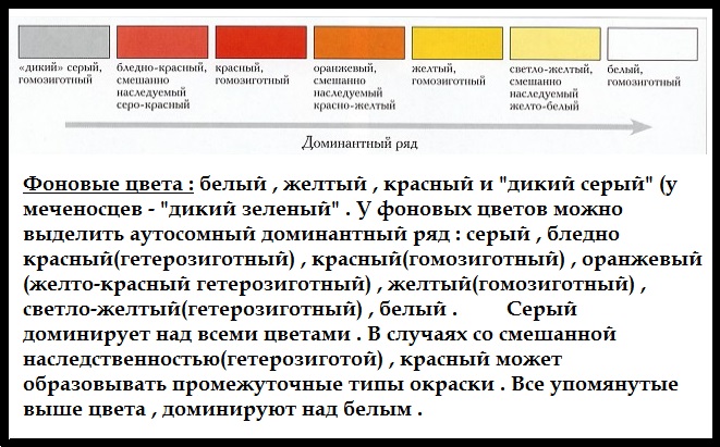 - 2-й крест - ВоО х ВоО = ВоВо+ ВоО+ВоО+ОО = 25% ВоВо гомозигота вэгтэйл + 50% ВоО гетерозигота вэгтэйл + 25% ОО свободны от аллели вэгтэйл . Поскольку помет от второго креста был получен от двух флаговых особей , то % флаговых мальков в помете равен 66,5% . Среди 25% мальков , имеющих гомозиготу по черному рисунку вэгтэйл , только 66,5% мальков будут еще и флаговые - их и берут в дальнейшее разведение породы флаговый гомозиготный вэгтэйл "в себе" .