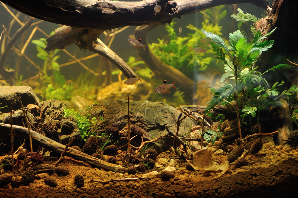 Листья положили в аквариум. Но неужели не знают уважаемые акваскейперы, что нужно подержать их предварительно пару дней в воде, что-бы они не делали воду коричневой и не заванивали аквариум?