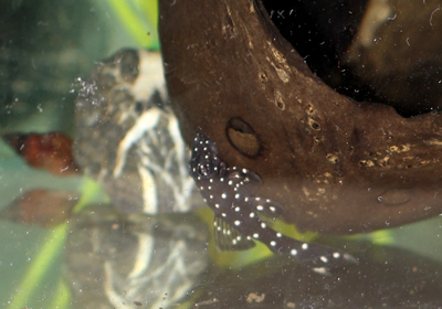 Очередной нерест произошел 29 марта. На кануне выклева возле трубки стали появляться икринки и пришлось вмешаться. На скорую руку из шприца для тортов был сооружен инкубатор. В отличии от самцов L 340, которых совершенно невозможно, при необходимости, вытряхнуть из трубки, наш "родитель " покинул трубку без проблем. Некоторые икринки были приклеены к керамике и пришлось применить силу, что бы их отделить. По видимому, они были травмированы. На видео видно "тень" личинки, которая еще жива, но, наверное, ее желточный мешок был поврежден моей неумелой "операцией".