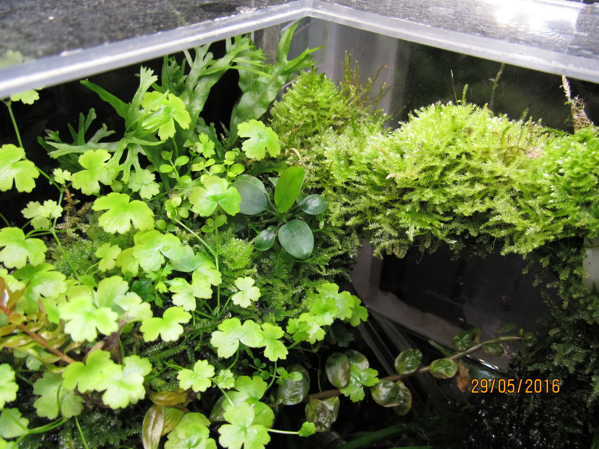 После лечения от планарии сделал фото. Растет все потихоньку, добавил карликовый лимонник в палюдариумы, нравится как он меняет цвет в темно коричневый на воздухе. Первый палюдариум зарос очень сильно - почвопокровка сплошным ковром все закрыла. В нём сейчас начала цвести буцефаландра SilverPowder.