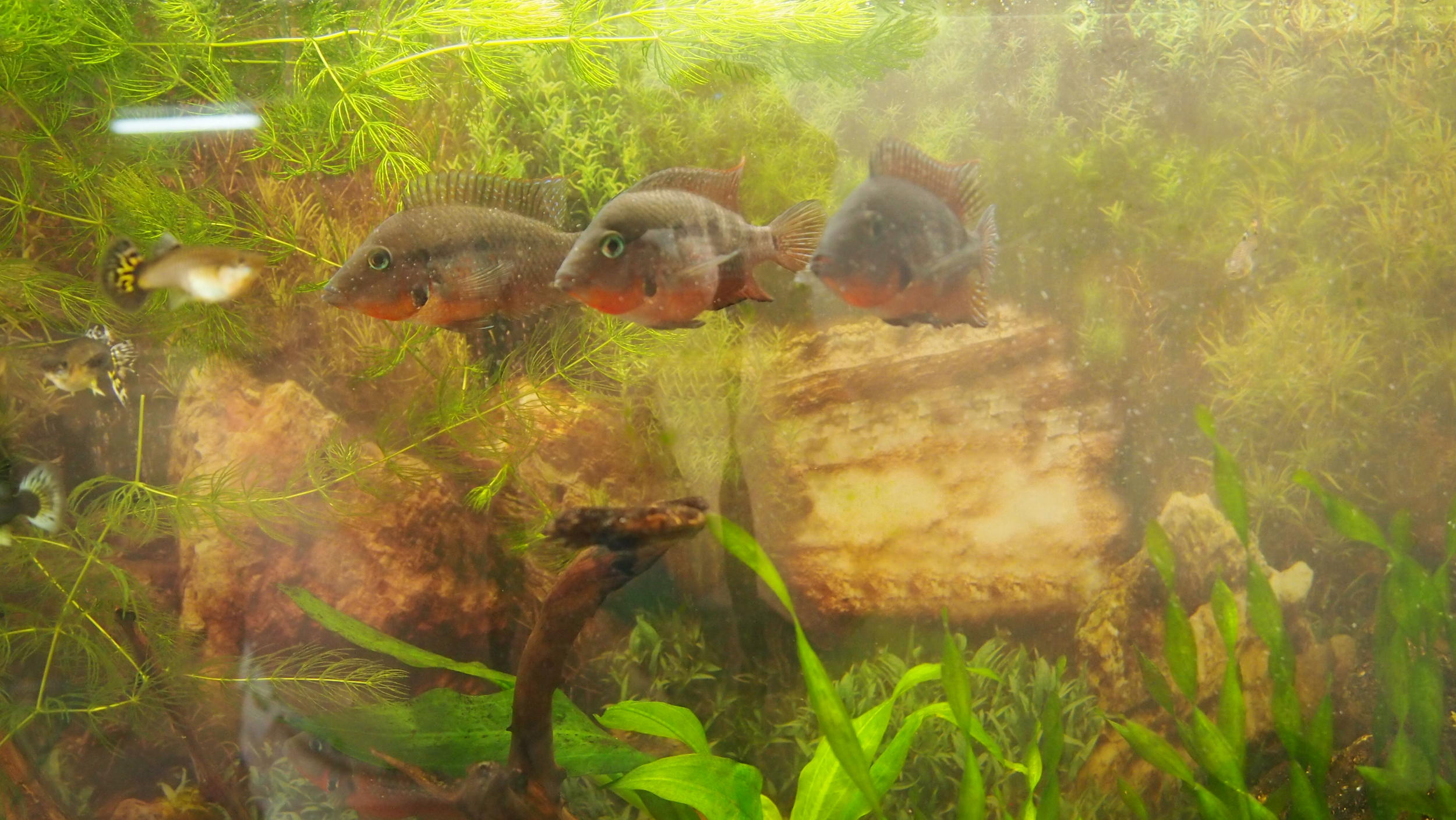 Судя по последней фотографии, Вы их перекармливаете, ожиревшая рыба теряет способность к размножению. В возрасте около 2 лет, самка должна быть, примерно, в 1.5 раза мельче самца. Если бы у Вас была самка, самцы устроили бы войну, за ее внимание и территорию.