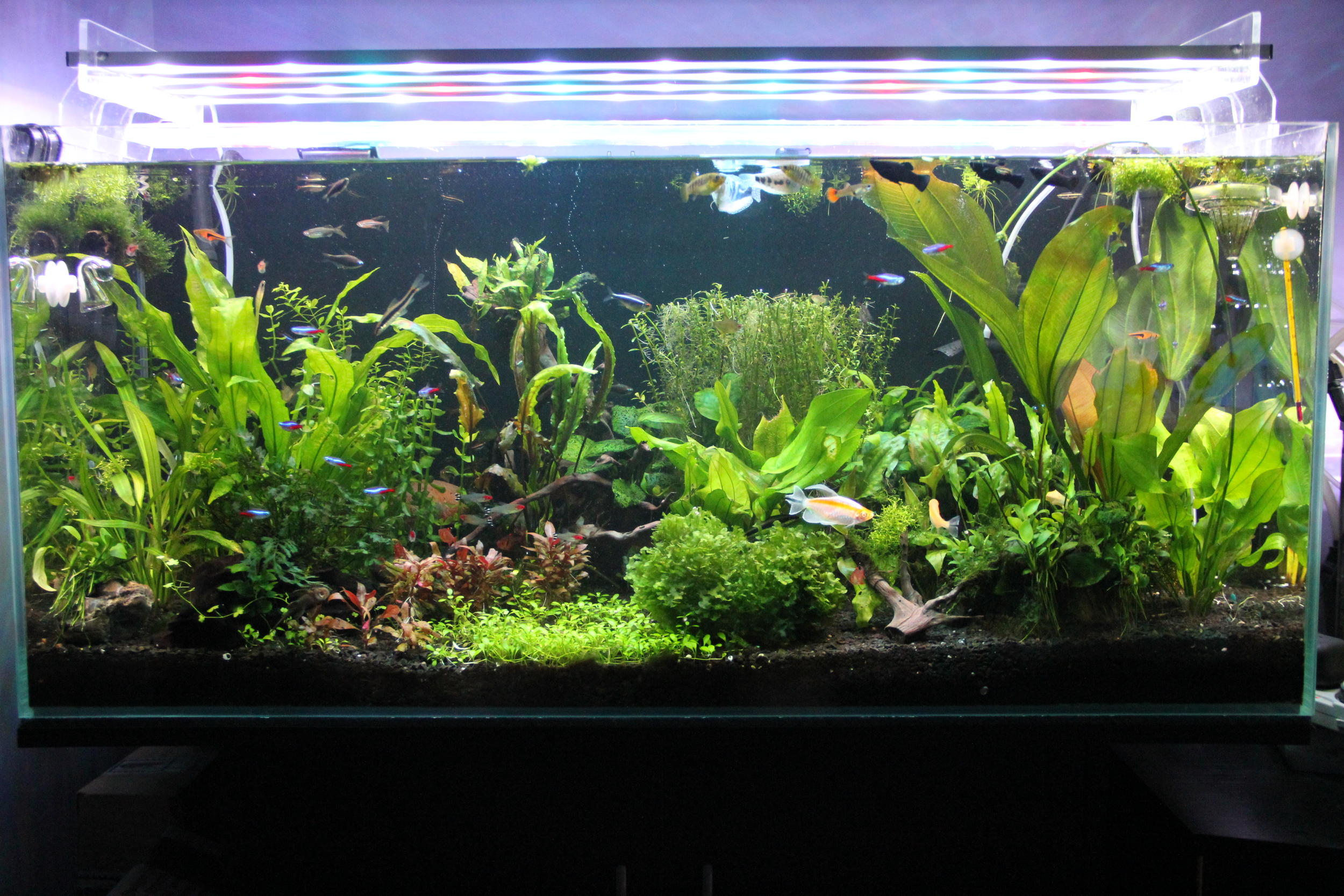 живет харацинка (неоны, данио, гупяшки) и несколько анцыструсов. Кормлю в основном заморозкой (дафния, циклоп, артемия), но иногда даю сухой корм и таблетки для сомов