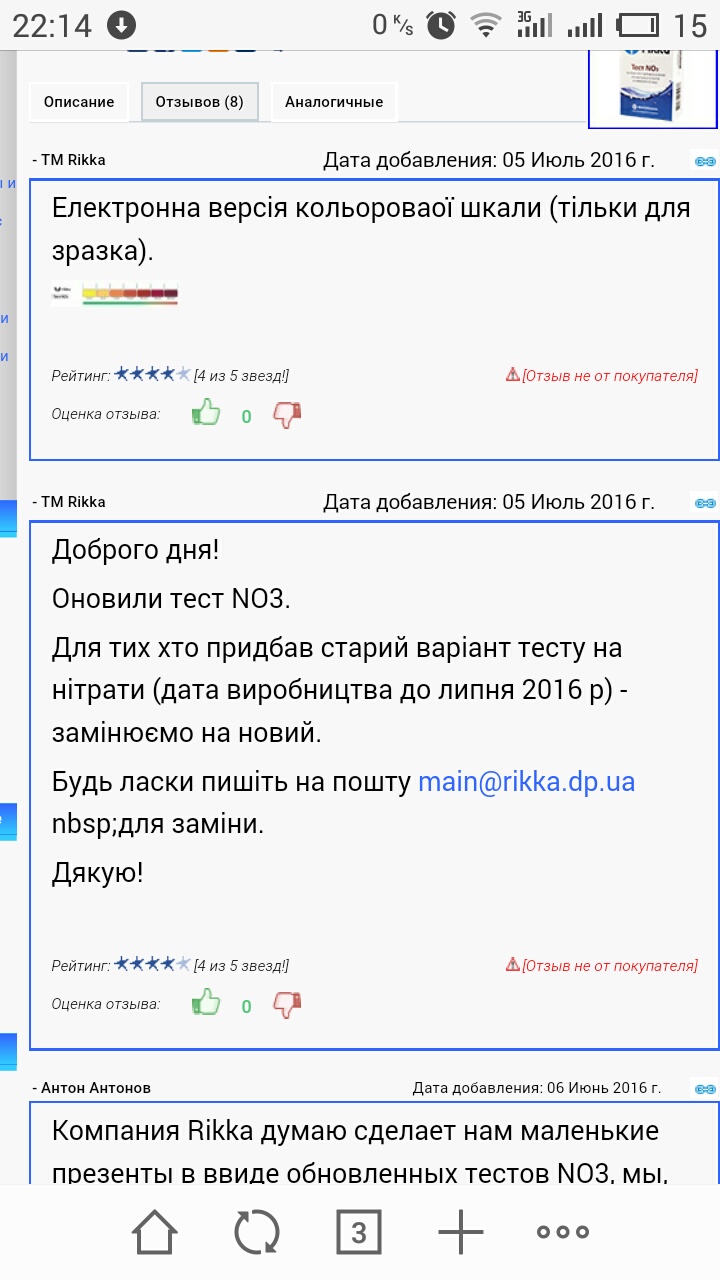 На сайте интернет-магазина Арована ТМ Rikka сообщили о замене тестов на нитраты всем купившим их до июля 2016, а также разместили картинку новой шкалы. Все кто "попал" с нитрат-тестами могут написать им на почту main@rikka.dp.ua для согласования замены.