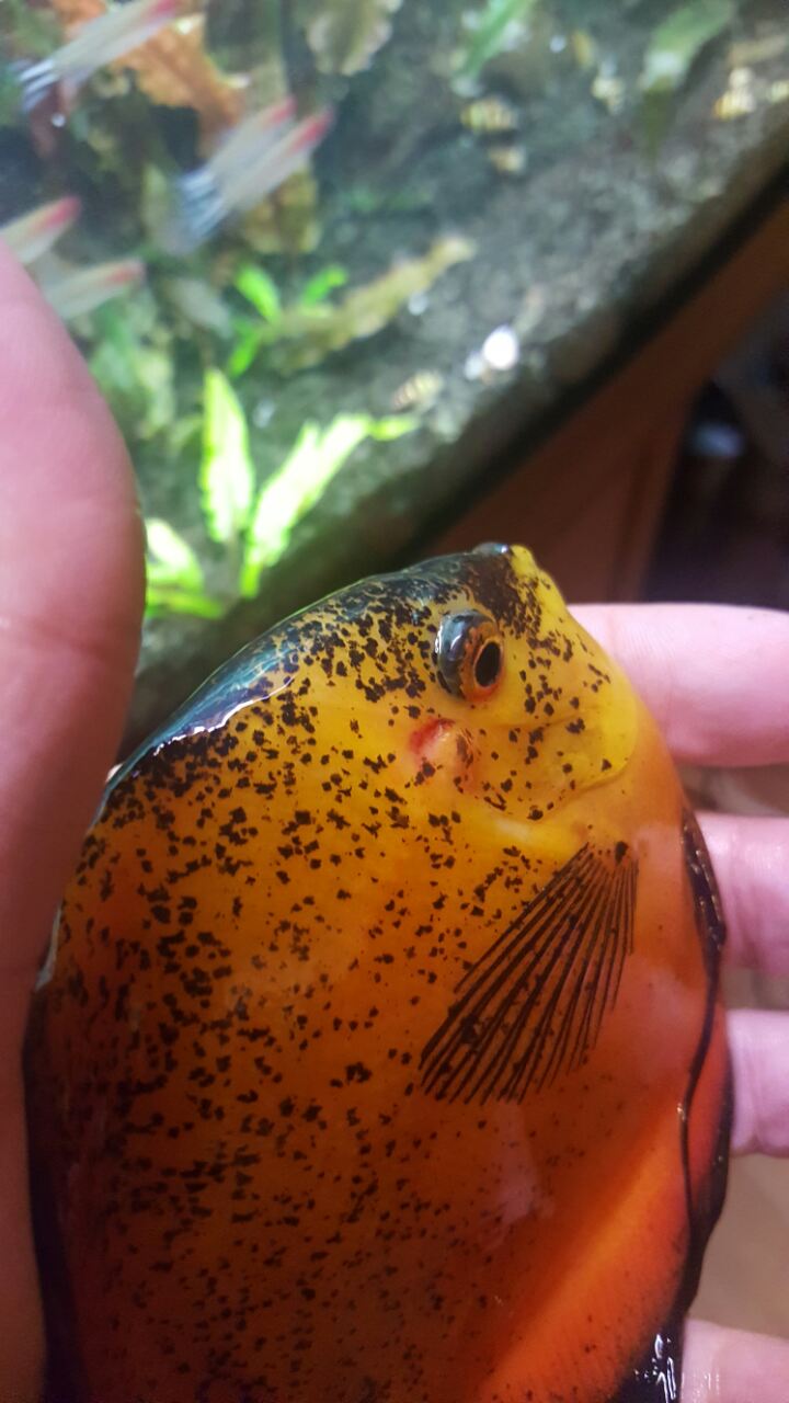 Доброго вечора, потрібна допомога, у дискуса на хвостовому плавнику з'явилась біла цятка, згодом ще три, як допомогти рибі. Долучення 569521