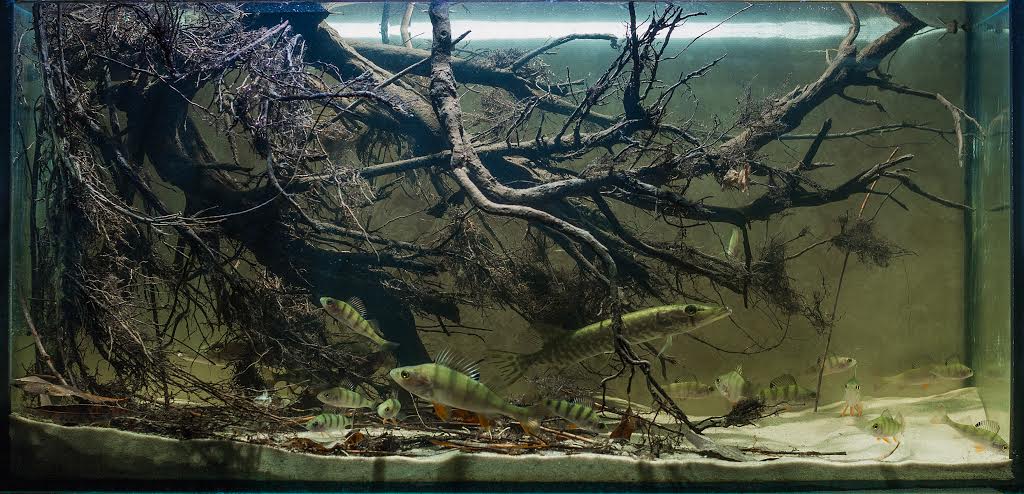 Біотоп задумувався як дослідний із максимально можливим завантаженням гідробіонтами. Окуні в замкнутому об'ємі не полюють на інших співрозмірних із ними риб, ганяти можуть, але не їсти; а от між собою сутички - постійно. За два повні місяці в акваріумі менший і слабший окунь виріс із 7,5 см до 7,8, а більший домінантний - 7,8-8,5, інші риби додали по пару міліметрів.