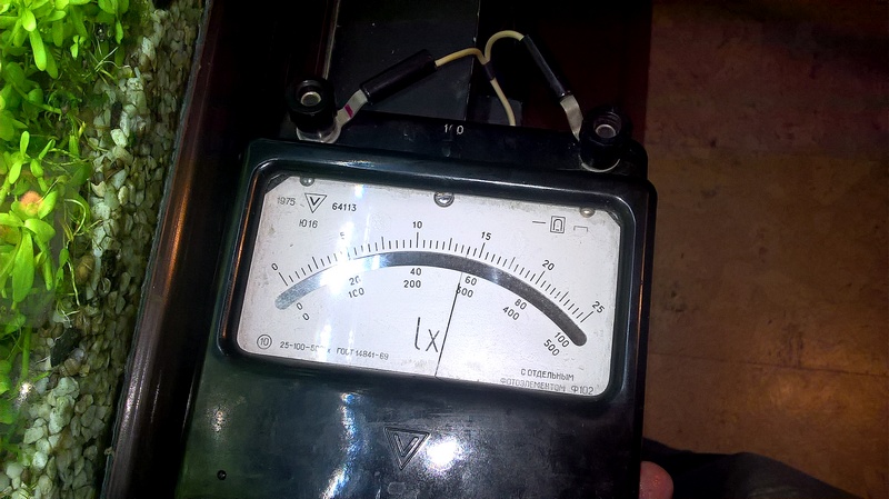 После прополки 30.10.16 я замерял освещенность на дне. Протупил- забыл сразу выложить. Фото во вложении. Освещенность получилась 3400лк. (!) Напомню, с заросшим верхом была 1750 лк. Вдвое... Понятно теперь чего трава попросила дополнительно удобрений и, похоже, газу. Похоже на то, что и одного светильника достаточно для среднефорсированного травника.