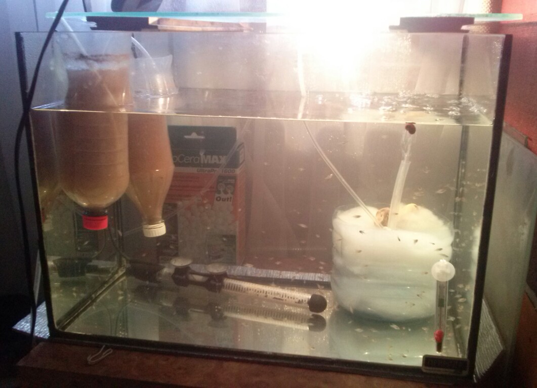 Вот цеолита нету то засыпал кварц, 30л объём использовал ведерко из под моянеза, компрессор на 50 литров, пузырят лудше чем губка аэрлифт, скалярии крутяться ну мальки в пузырях, а то от губки им не так было да и в ведерке кварц капошат