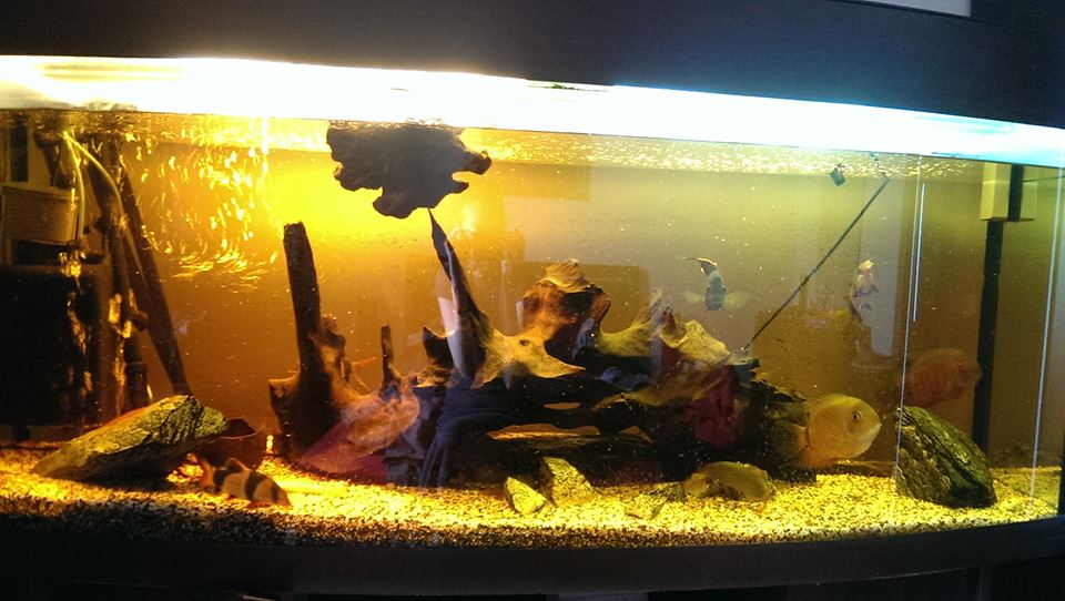 + немногочисленное, но население (боции-клоуны и боции-неклоуны -точное количество подсчету не поддается — до 10, вероятно), сомики (3 звезды и 1 альбиносный король), северумы помаранчевые (3) и еще один живчик вида акара бирюзовая — самый прожорливый, не вырос, но крутецкий рыбас)