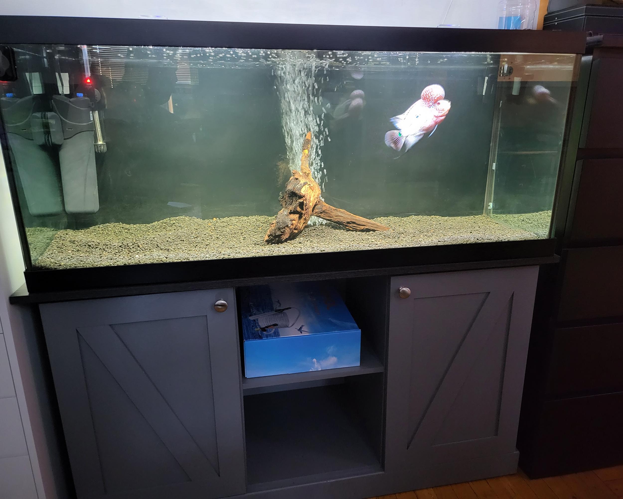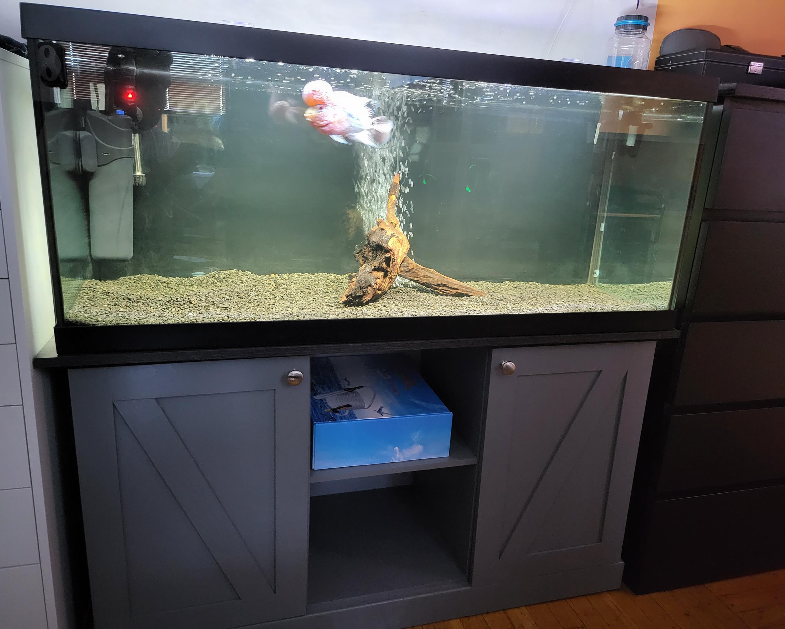 Была банка на 130л сначала для хорна. Решил ему дать дом больше. Купил новый аквариум, тумбу, крышки, лампы, фильтр.