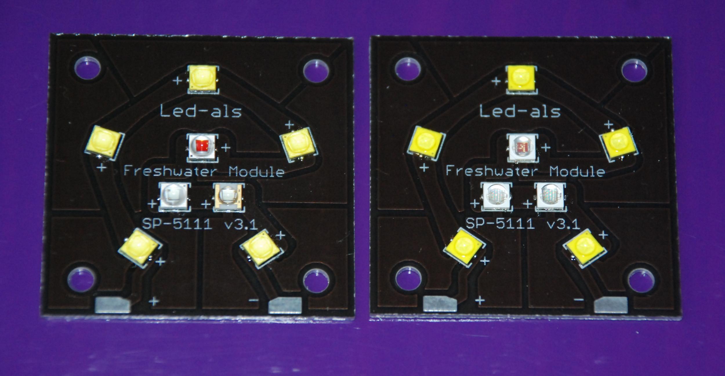Если же о пресноводном варианте, то я считал состав на основе Prolight PK2N: первый канал - 4 холодно-белых + голубой + циан, второй канал - 4 холодно-белых + красный 625 нм + красный 660 нм.