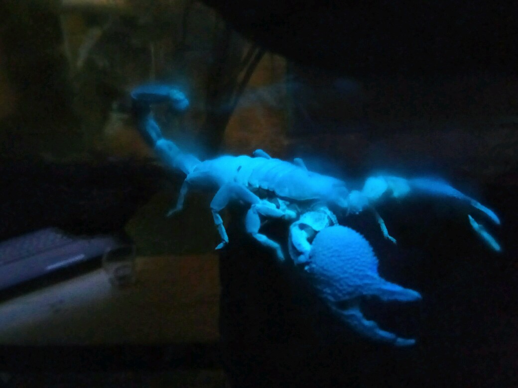 Пс. Оказывается, скорпионы под ультрафиолетом флуоресцируют, впервые узнала. На фото они голубые, но в жизни ближе к лазоревому, холодному салатовому, очень красиво.