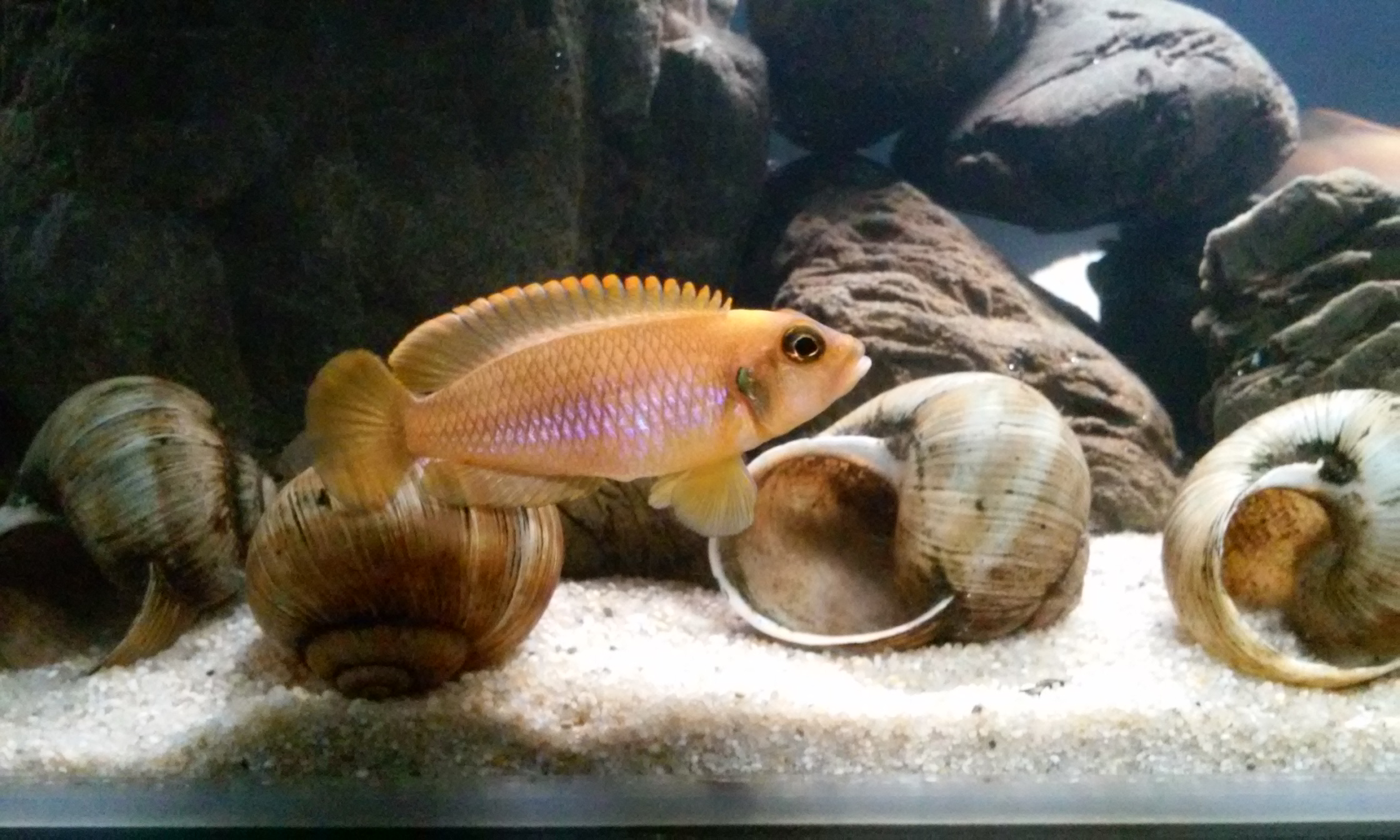 Через несколько дней приехали рыбки. После долгих мучений все же было принято решение поселить Lamprologus ocellatus "Gold". За рыбку спасибо жителю Днепра, форумчанину OLEG DP . Рыба приехала здоровая и бодрая. Отдельное спасибо за бонус. Итого по населению: 5 лампрологусов.