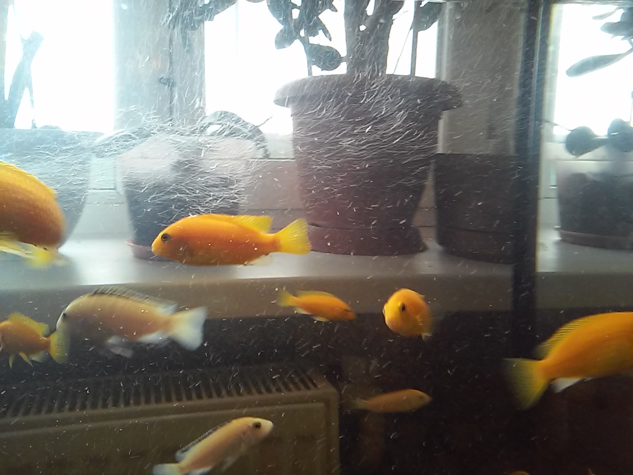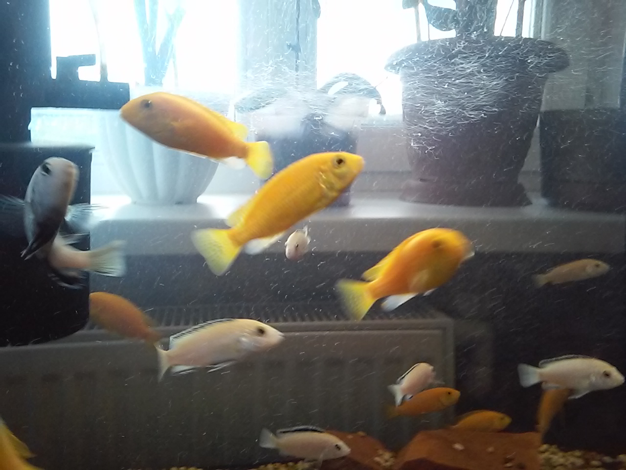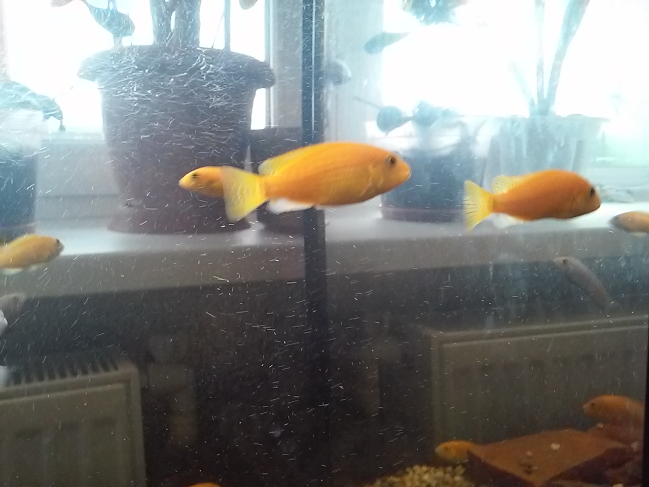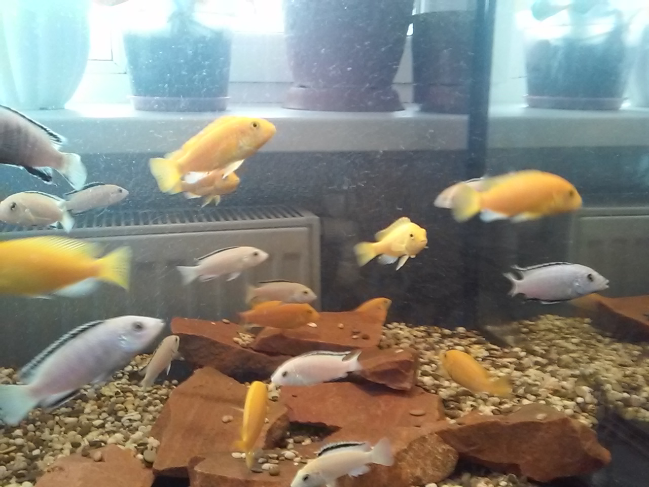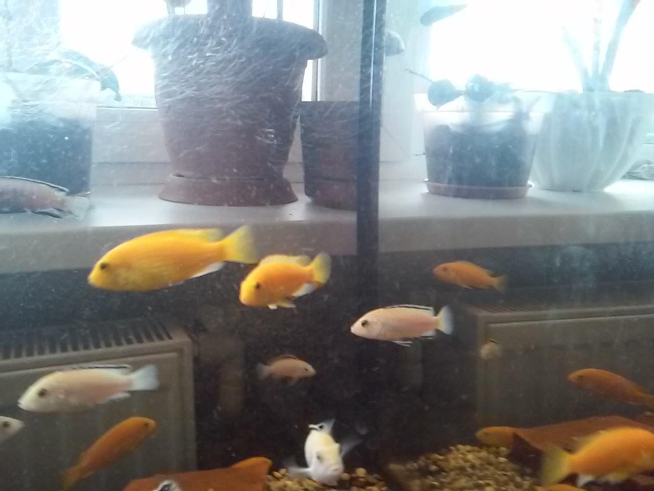 Ув. коллеги аквариумисты разводчики малавийских цихлид, прошу помощи от Вас в определении вида малавийской цихлиды. Примерно чуть больше года назад приобрел малька Трофеопс золотой (Tropheops macrophthalmus gold). Содержался этот вид с Лабидохромисом Нката Бей (белые) в довольно просторном аквариуме -250 л. Получил в итоге малька . Вопрос к вам ,тем кто знает тонкости внешнего вида этого вида, подсказать, соответствуют мои рыбы указанному виду.Вылаживаю фото моих производов.