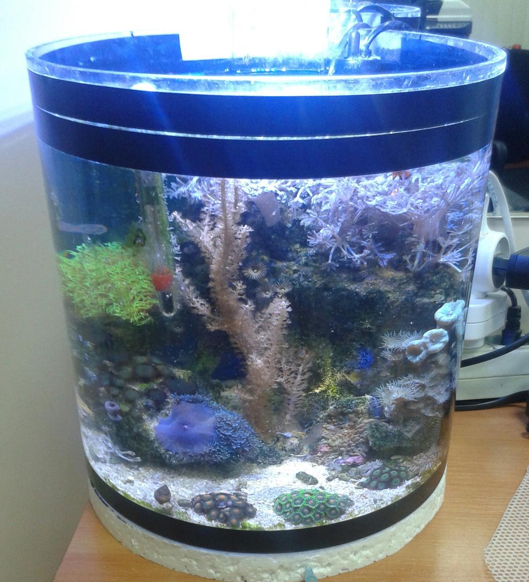 В общем история такая! Жена вышла с декрета на работу, а сотрудники завели пресный аквас. Такое приметивное, без света, вместо грунта галька крупная и ракушки (кто что, с отпуска привозил-все туда!). Из живности улитки, валиснерия и гупешки Как то тускло ей было наблюдать за етим действом и уговорила сотрудников, слить это болотце и поставить морской