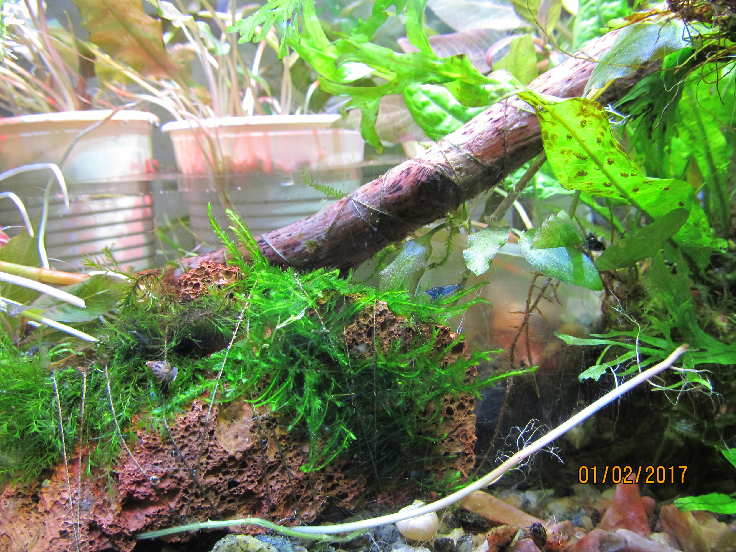 Свежие фото палюдариумов. В один из них (каркасный) не добирались руки с июня прошлого года. Всё было переплетено корнями и стеблями карликового лимонника и заросло мхами и ниткой. Но  как не странно  , все расло -без всякого удо, СО2 и даже подмен. После чистки посадил туда синих креветосов - пусть обживают.