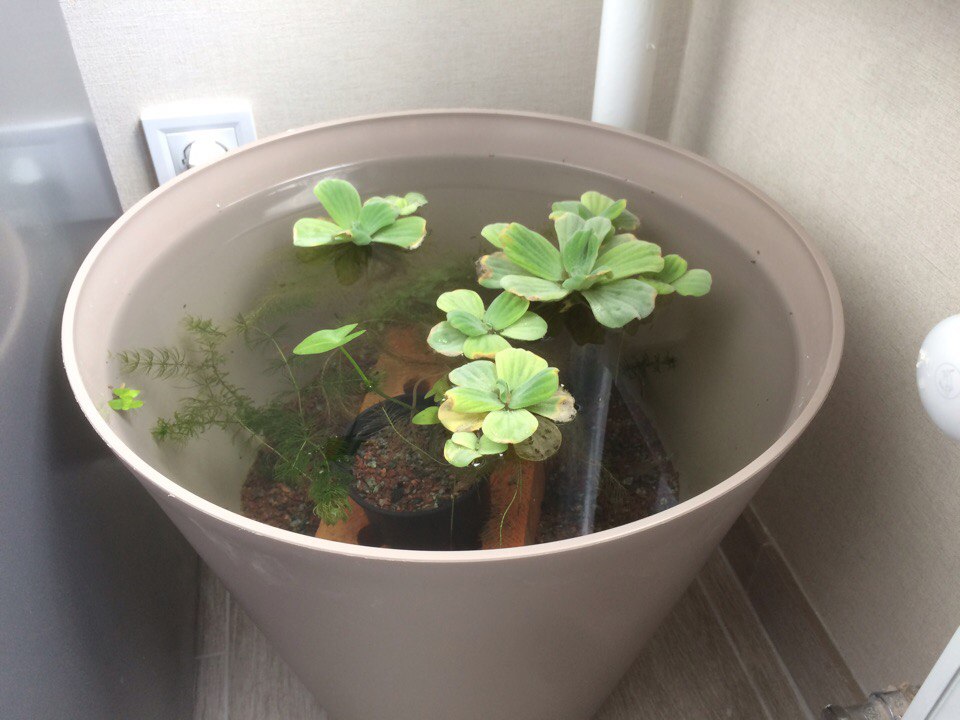 Вот мой мини пруд, правда в квартире, но растет там роголистник, элодея, ряска, стрелолист в горшочке - все пойманное в Днепре + пистия взятая в университетском бот. саду. Пока что живут толькок 3 гуппи, несколько теодоксусов и одна дрейсена (пойманы в том же Днепре) и уйма физ, сегодня на птичке собираюсь докупить еще рыбасиков, и на след неделе поставить туда горшочек с ципирусом и добавить подсветку. "горшку" 3 недели.