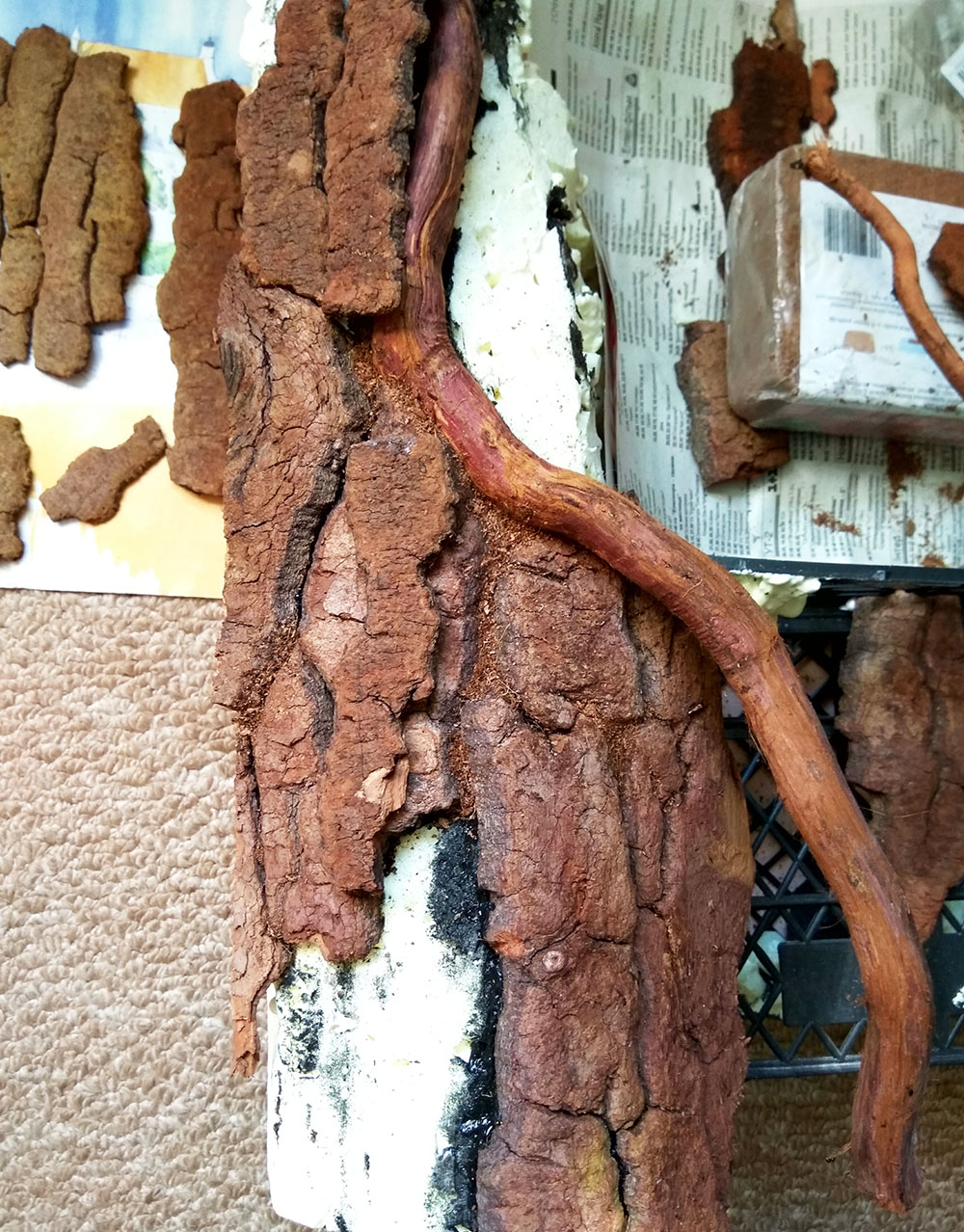 Кору і коріння проварив та висушив. Клею на чорний акваріумний силікон, щоб піна не просвічувала. Великі щілини заповнюю кокосовою стружкою на силіконі.