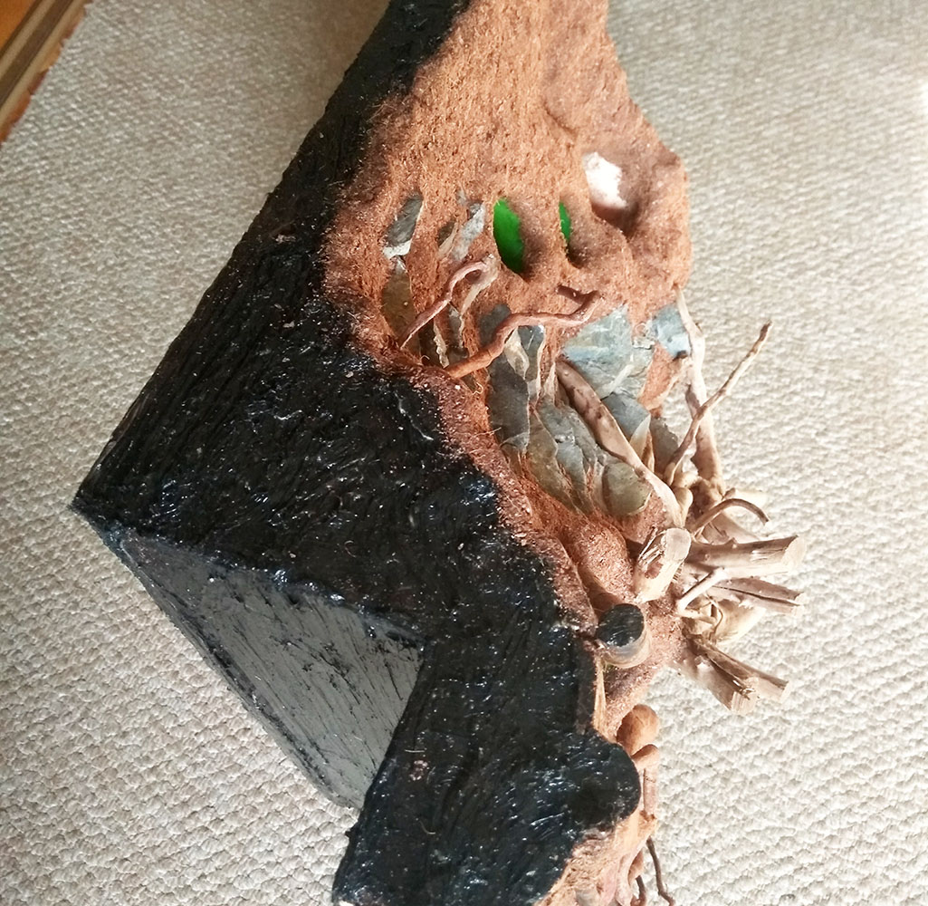 Проклеїв рельєф кокосовим субстратом. Розмочувати пресований брикет у воді не хотів, щоб не витрачати час на розкладання, просушування. Просто відламував кусок і розтирав у руках. Клеїв на чорний акваріумний силікон. Щоб не повимазувати каміння і корягу, силікон напускав у шприц 2 мл і ним проходився у складних місцях.