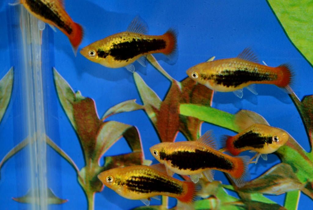Один раз , Ради эксперемента держал вместе с малька меченосцев и пецилий вариатус . По мере взросления и созревания убирал определяющихся по полу самцов одного и самок другого вида . Через полтора года было получено однотипное , малочисленное потомство . На фото по 1-му закону Менделя о единообразии потомков 1-го поколения . Хотя в моем малочисленном помете все были самцами(характерные для вариатус вертикальные полосы на корпусе) См. фото 2 .