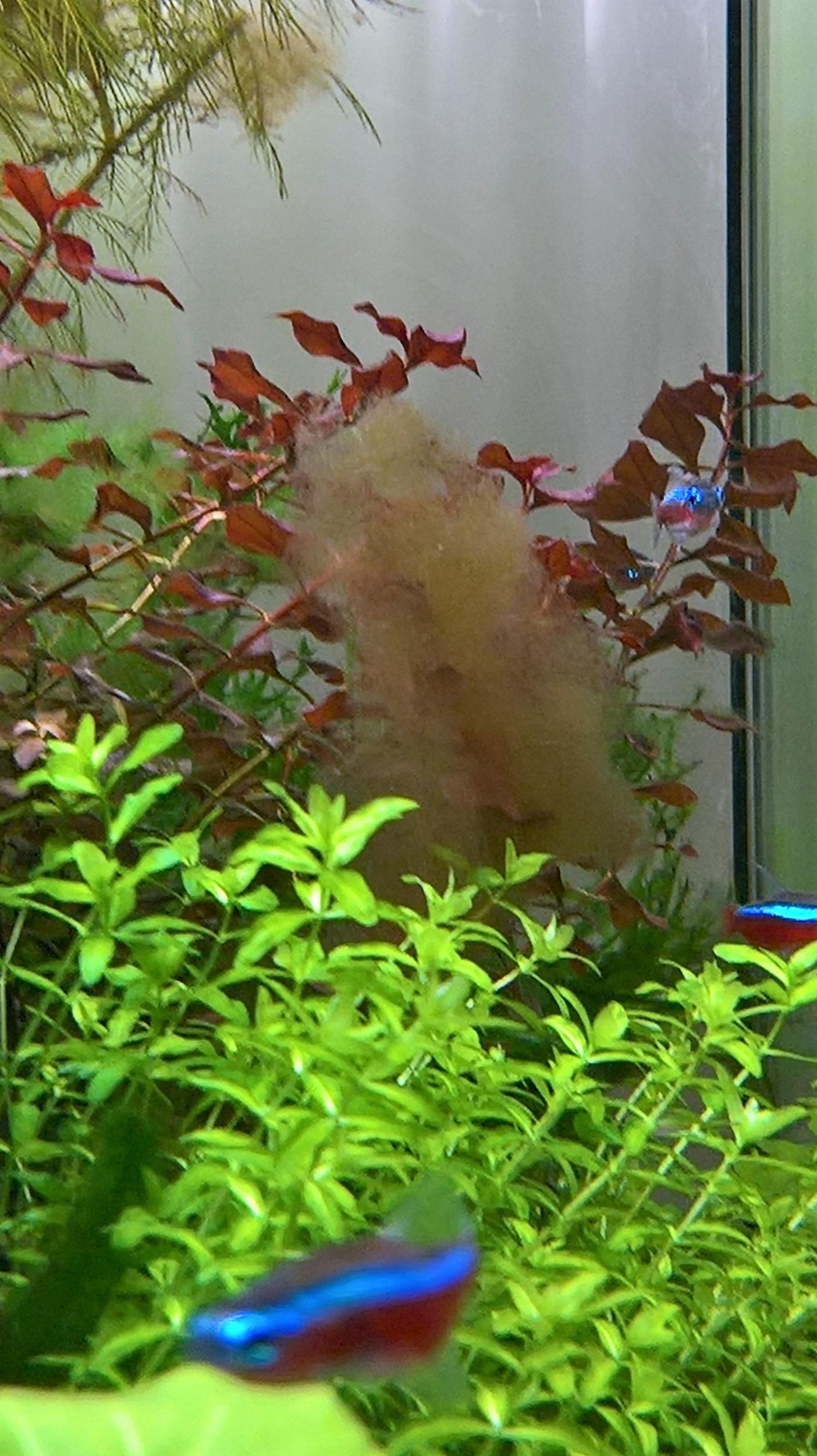 Объем и габариты аквариума (Д*Ш*В): 50л Когда запущен аквариум (дата): октябрь 2016 Параметры воды в аквариуме (аммиак, нитрит, нитрат - обязательны): Аммиак, нитрит нули, нитрат колеблется 5-15, фосфат колеблется 0,1-0,5 Рыбы в аквариуме (размер, вид, количество): красный неон 25 шт, коридорас джули 4 шт. Растения в аквариуме (виды, плотность посадки): Разные, плотно. Внесение удобрений и CO2: моносоставы нитрата, фосфата, калия по мере необходимости, микро с железом раз в неделю. За удобрения отвечаю- от ДЕПСа Грунт (и подложка если присутствует): АДА "амазония". Больной вопрос. Запускался аквариум до меня, полное ощущение что грунт был переморожен, пылит как последняя сволочь. Декорации в аквариуме (материал): Несколько кусков лавы как субстрат для мхов, анубиасов и т.д. Оборудование (фильтры, компрессор, нагреватель и т.д.): внешний фильтр флюваль 106 А202, грелка 75 вт Стандартная температура: 25 Подмена воды (частота и объем): Один раз в неделю 30% водопровод Освещение (тип ламп, спектр, количество, попадает ли свет из окна): PteroRay 50 см, 6500К 2550 лм= 2500 лм на дне. 8 часов. Кормление (чем кормите, как часто, как много): Хлопья "новобел" от ЖБЛ Изменения, предшествующие появившейся проблеме: В июле аквариум стоял без света. Растения выжили нормално, после включения света пару недель повоевал с обрастаниями на стеклах, немного со спирогирой. Осталось удавить остатки одогониума. Описание вашей проблемы: Сегодня меня встретил сюрприз. Такая вот фигня как на фото.