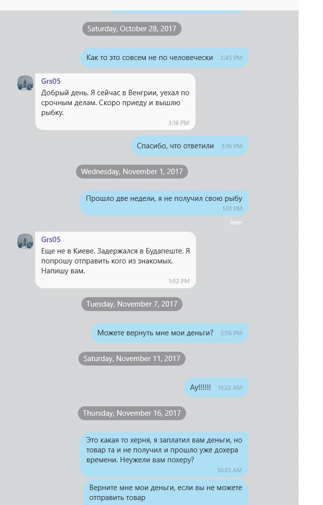 5168742358773517 Бондарь Е.В. Раньше покупал у него рыбу и многие покупали. А теперь - 19 октября он написал мне предложение на хелмана и в тот же день я перечислил ему деньги. До сих пор я не получил ни рыбы ни денег. В вайбер не отвечает и телефон в отключке. Скрины переписки прилагаю