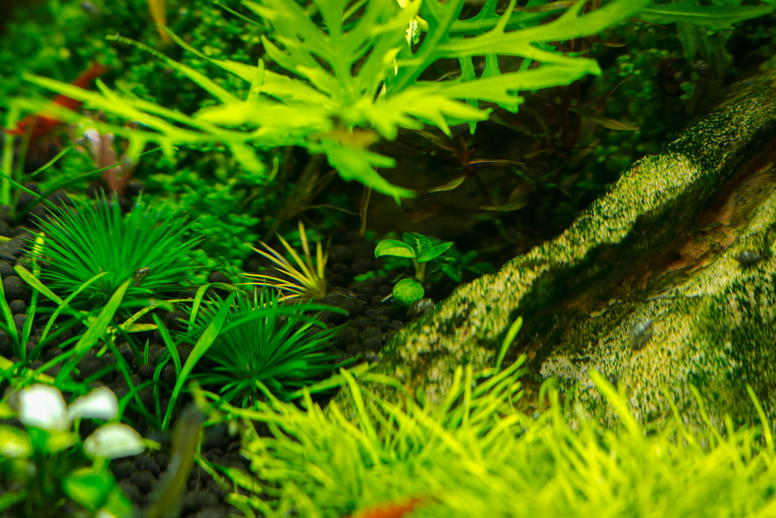 GDA поселившиеся на камнях отступать не собираются. Лишь старательные отоцинклюсы негросы, физы и креветки, оставляют в них редкие проплешины.