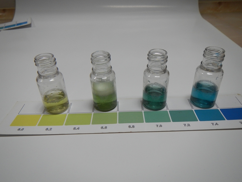 Вот я тут сделал наглядную проверку. Фото 1 это проверка pH воды тестом 5-9 с шагом через 0.5. Фото 2 это та же вода только в нее уже добавлен индикатор СО2 и сверка по шкале от теста 6-7.6 с шагом 0.2. На третьем фото все вместе.Четко видно абсолютное соответствие pH в обоих случаях,при разных индикаторах.
