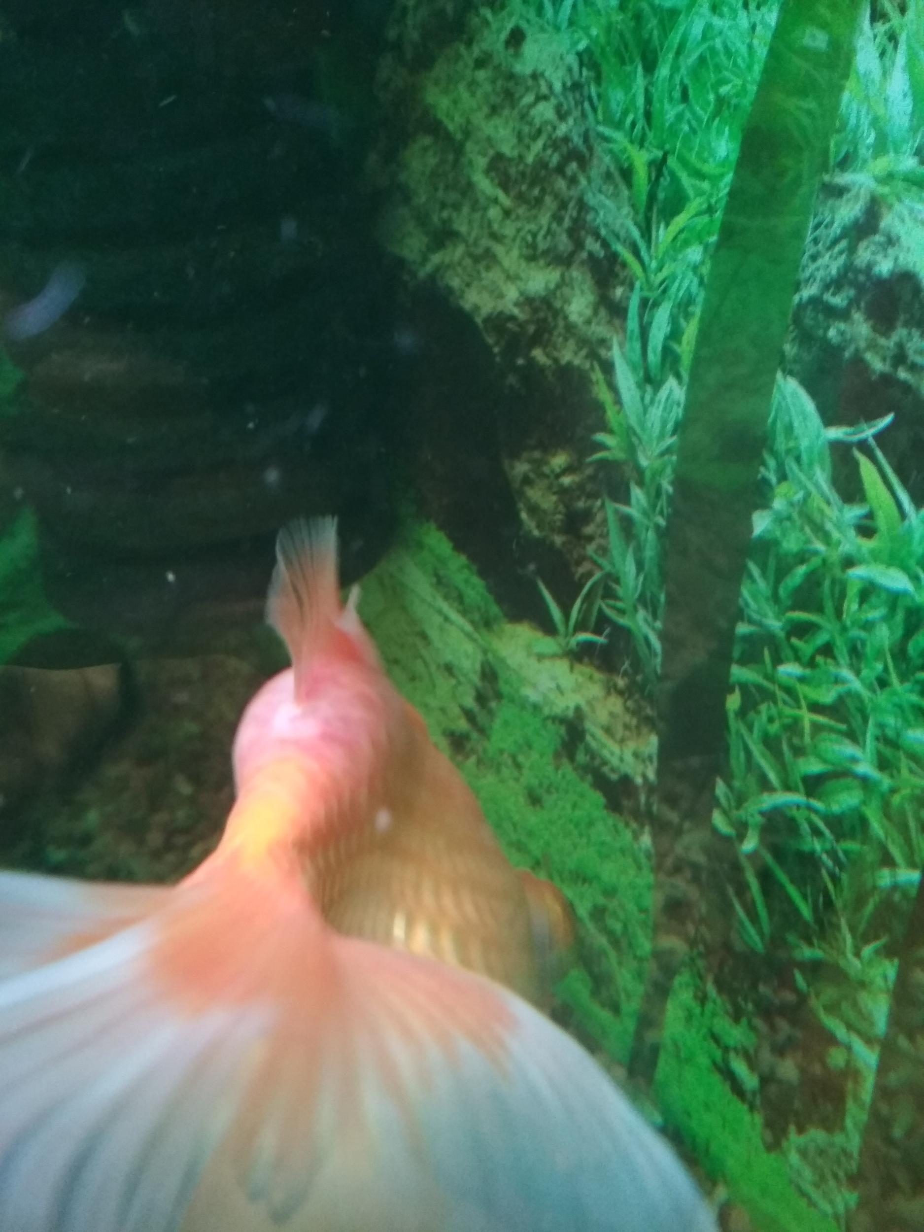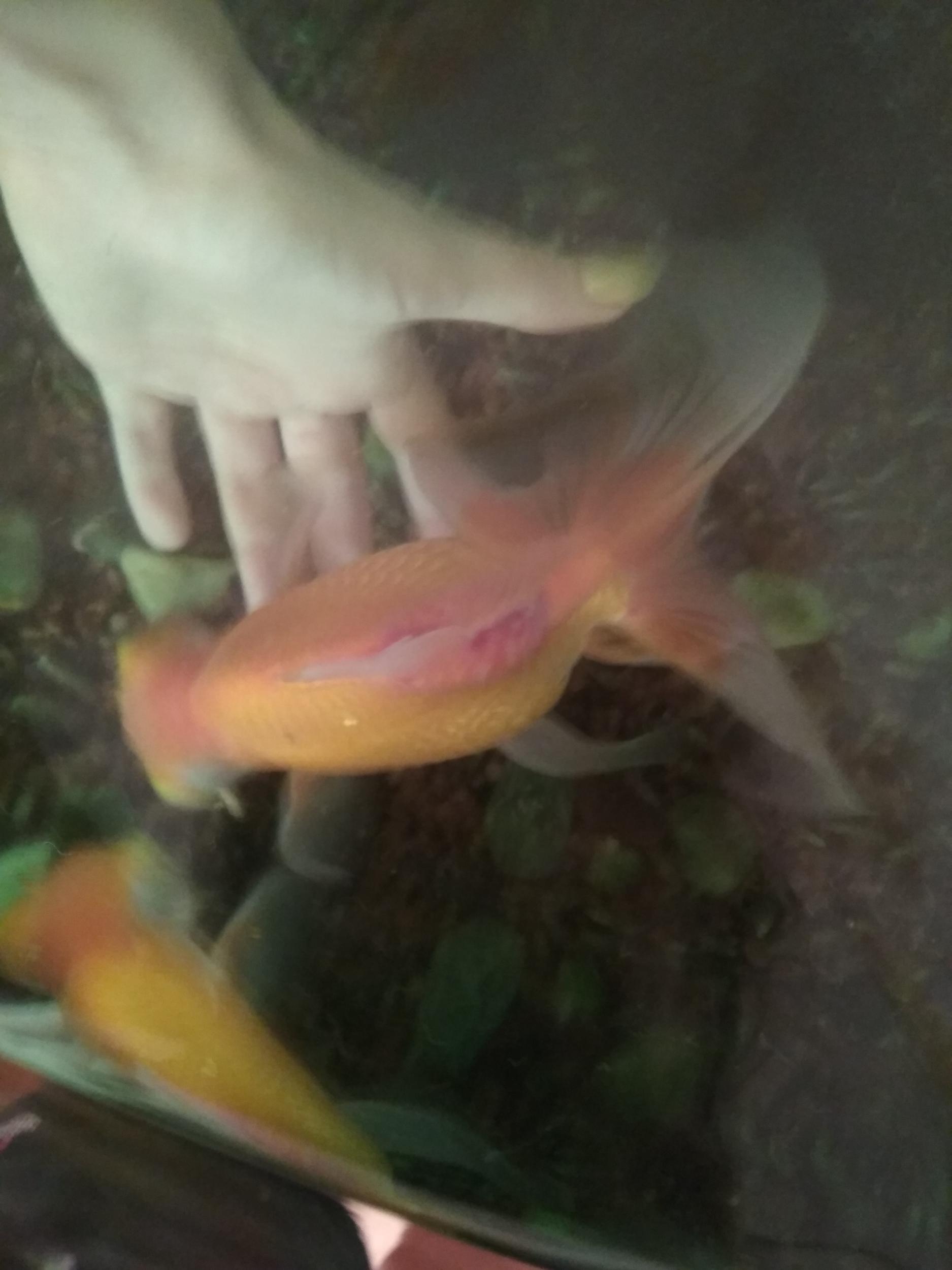 Помогите, пожалуйста, идентифицировать хворь для ее локализации и устранения: в области спинного плавника на спинке опухоль с кровоподтеками, область поражения около 2х3 см, выглядит страшно, такое ощущение, что "телескоп" по быстрому превращается в "жемчужинку". Рыбка продолжает быть активной, плавает без нарушения координации, ест хорошо и даже норовит откусить хозяйке руку.