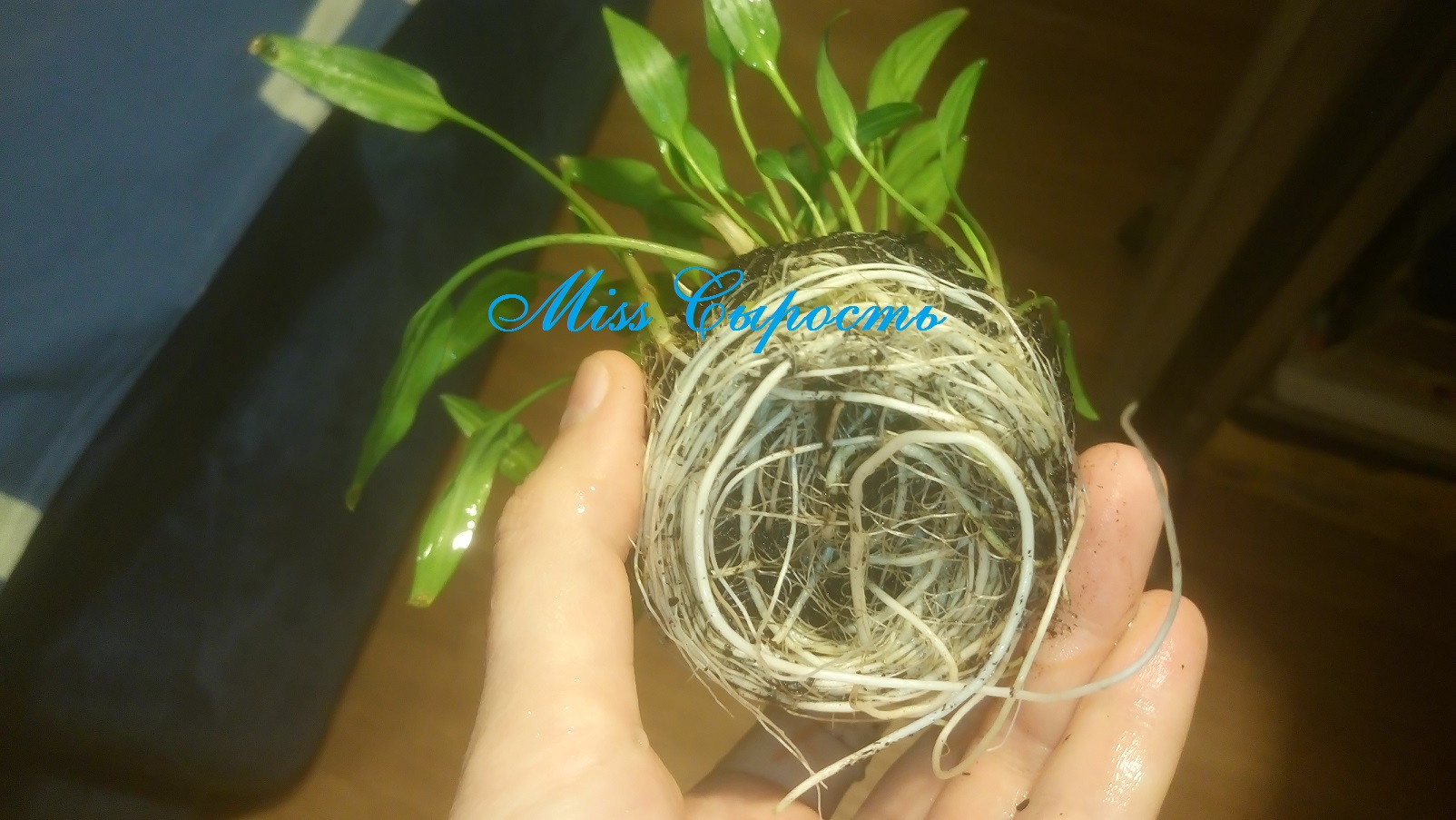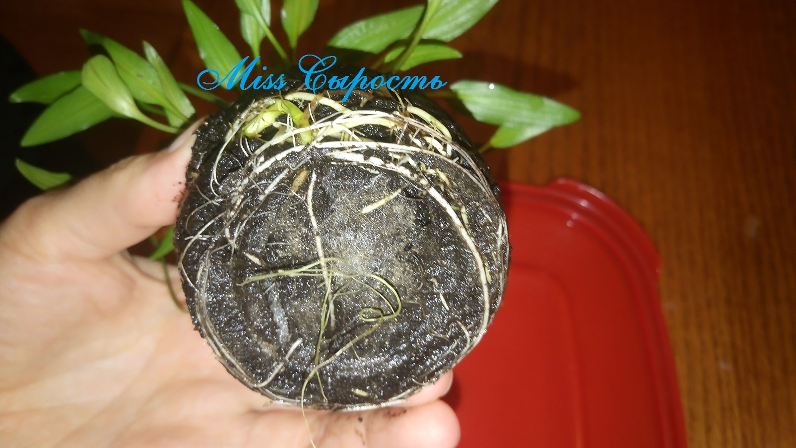 Самой стойкой оказалась Вабикуса с Криптокаринами Парва. Она медленно выгоняла листики и ни каких признаков недовольства не выказывала. Даже в отверстии горшка показались её корешки. Я решила снять горшок и посмотреть как корни оплели ком земли. Перед посадкой я обрезала корни и оставила их по 5 см длиной. Сейчас корни уже начинают оплетать питательный субстрат, но ещё маловато.