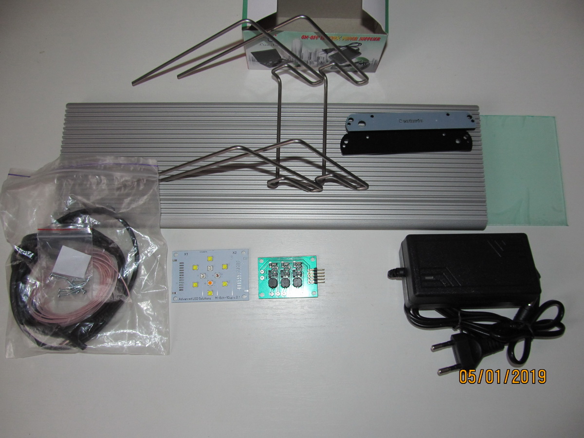 Набор для сборки света в аквариум 55 л отправлен Заказчику. Cборка на базе диодов Сree-Prolight - 27 Вт, световой поток 2545 лм. Профиль АН-110.