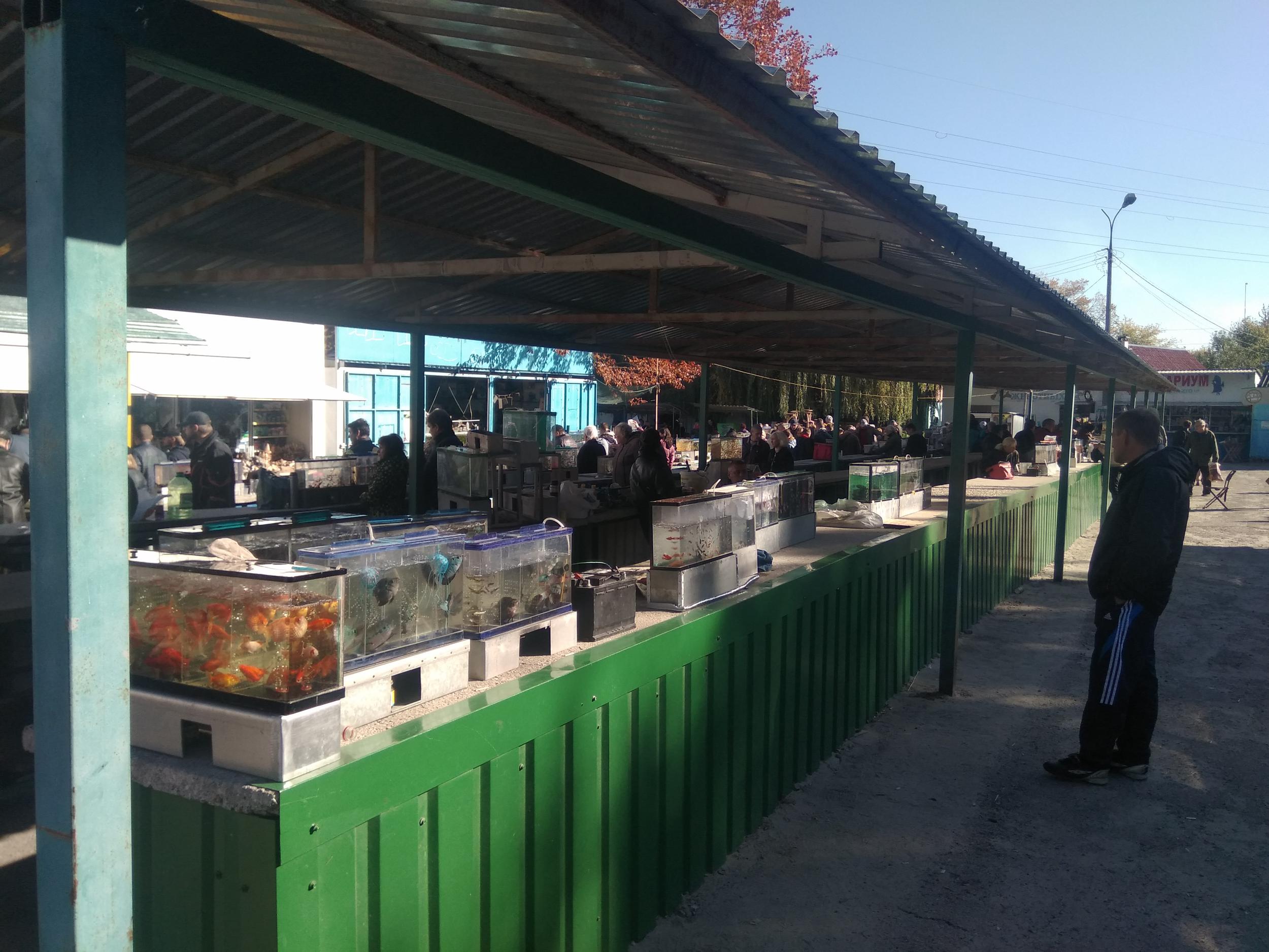 ...Первый ряд от кормовиков(что на фото) покрыли крышей.Знаю,что многим из арендующих эти места под крышей пришлось заплптить свои кровные и за крышу, и за возможно ,место под крышей.Но, так получилось на данный момент и я свидетель,что администрация рынка гоняла тех,кто не оплатил эти взносы,но стал под навес.А это как раз то место,что на фото.Поэтому и нет там многолюдья.Кроме того,тень от навеса легла и на следующий ряд,что плохо в эту пору года.Хотелось бы погреть ширму не денатуратом ,а солнышком.Поэтому оставшиеся продавцы сгрудились на ряду ,что грело солнышко.Там и было сверх тесно и ссорились меж собой.Но продавцов действительно стало намного меньше.Безлюдье первого ряда не только от экономических причин ,но и экономико-техническое.Не ставил себе задачу посмотреть ассортимент.Конечно,глофишь лидируют.Кто-то писал,что не видел черных,красных неонов.Так видел их...и ПОКУПАТЕЛИ,пусть не шеренгами,а поодиночке или парами,но наступали на ноги и вглыдывались в ширмы,мол,что у вас там есть?