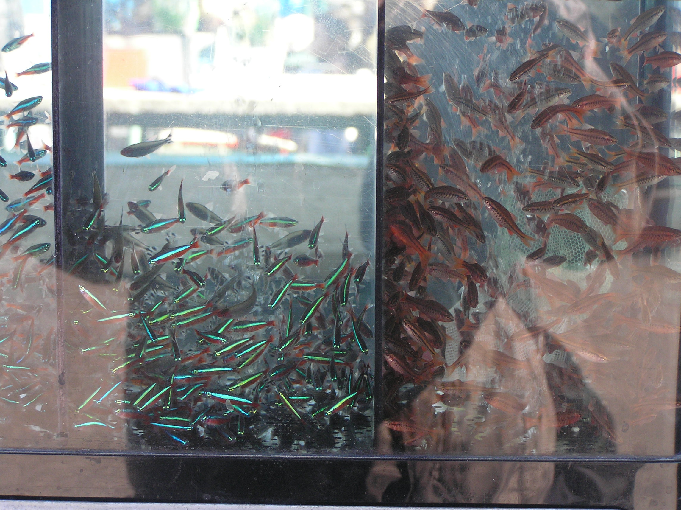 ...Сделав сначала контрольный обход,обратил внимание,что на ряду,наиболее освещенном солнцем,было большое количество Глофиш.Разумный маркетинговый ход.Все они сияли под яркими лучами солнца.Из-за такого обилия Глофиш у меня как-то пропал азарт и снял только 30-35%всего.Да и батарейки начали садится.Пройдя только по этому третьему ряду,насчитал 23 отсека ширм с глофиш.Считать по ширмам смысла не было,т.к. не все их отсеки были забиты этими рыбками.Вот такие приблизительно цифры по статистике этого одного,но выдающегося ряда.Солнце очень мешало снимать,блики.Поэтому прошу простить,если где нафордебачил.Есть и повторы,тоже не ругайте.