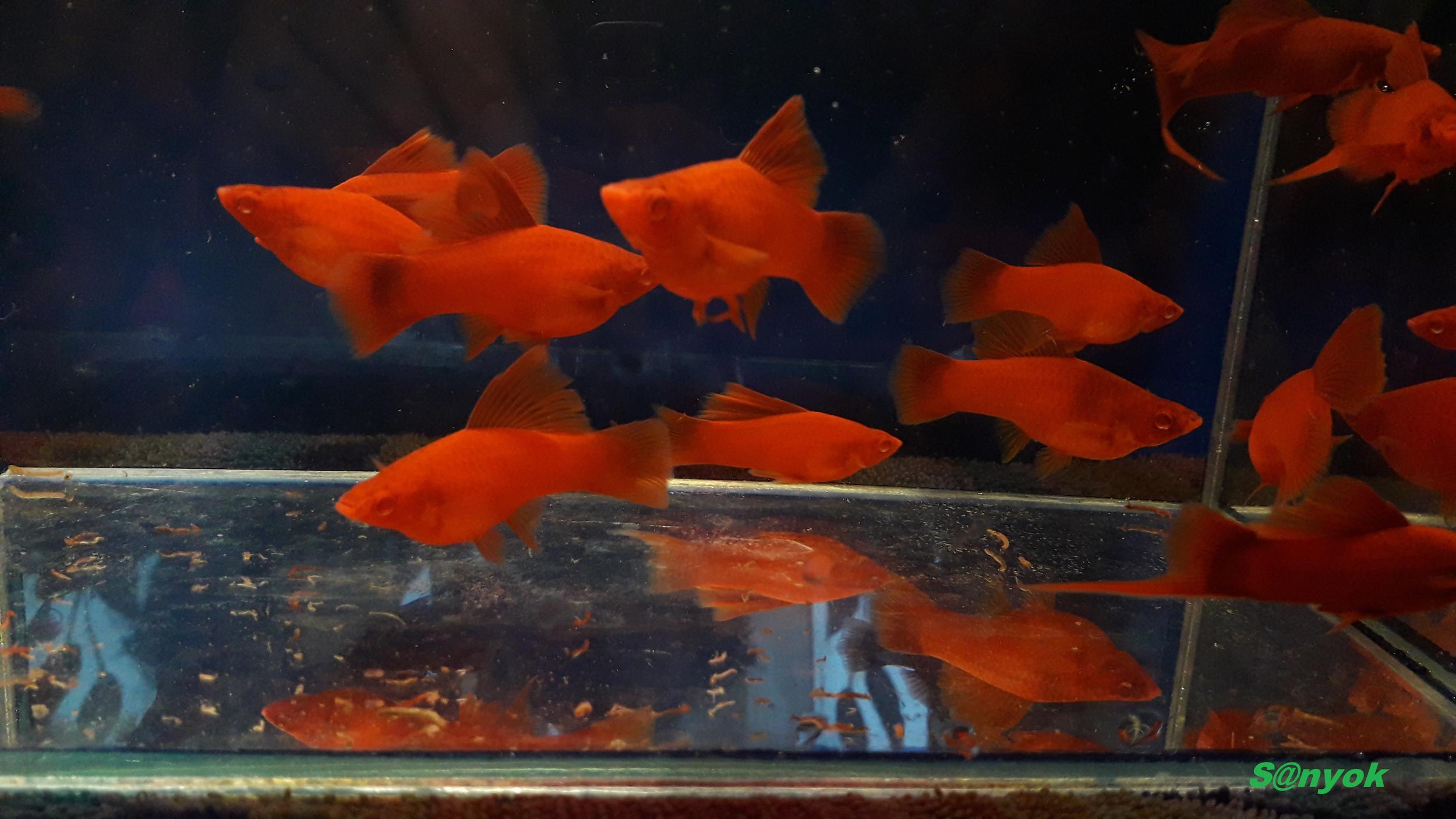 "Хочу поделится историей, как я получил своих рубинов��. Я уже лет восемь держу черных меченосцев, поскольку они гетерозиготы, то у меня нет особой нужды садить к черным самкам черных самцов, по моему личному убеждению, это им идет далеко не на пользу, а именно с каждым поколением уходит красный пигмент. Самый лучший вариант для скрещивания (личное мнение), это самцы рубина, этим крестом "убиваем сразу двух зайцев"��, а именно и кровушку подмешиваем и красный пигмент некуда не уходит. И вот однажды одна черная самка дала из выводка несколько мальков странного окраса, а именно без черного пигмента, вместо него был какой-то белесый окрас, который слегка переходил в серый оттенок и глаз был красный��. Первая мысль, которая меня посетила, этот брак нужно спустить в унитаз. Потом вспомнил, что в это самое время на аквафоруме обсуждалась тема, в которой А. Черников использовал такой термин как Лютинос (признаюсь честно, что до этого я о них не слыхал), если не изменяет память, я ему позвонил и после нашего разговора решил их оставить, чтоб посмотреть, что из этого выйдет. Признаюсь, рыба выросла своеобразная, на мой взгляд даже симпатичная, но больше всего меня порадовало то, что они начали давать малька без серости, окрас был ровный ядовито-морковный, конечно не идеал и до рубина не дотягивал, но среди них были и насыщенно красные, которых я и оставлял на производителей. На данном этапе все идет нормально, без сбоев. Ниже выкладываю фото и видео согласно описанию. Вы не обессудьте, что я описал этот рассказ своими словами��. И самое главное не бойтесь экспериментировать!!!��"
