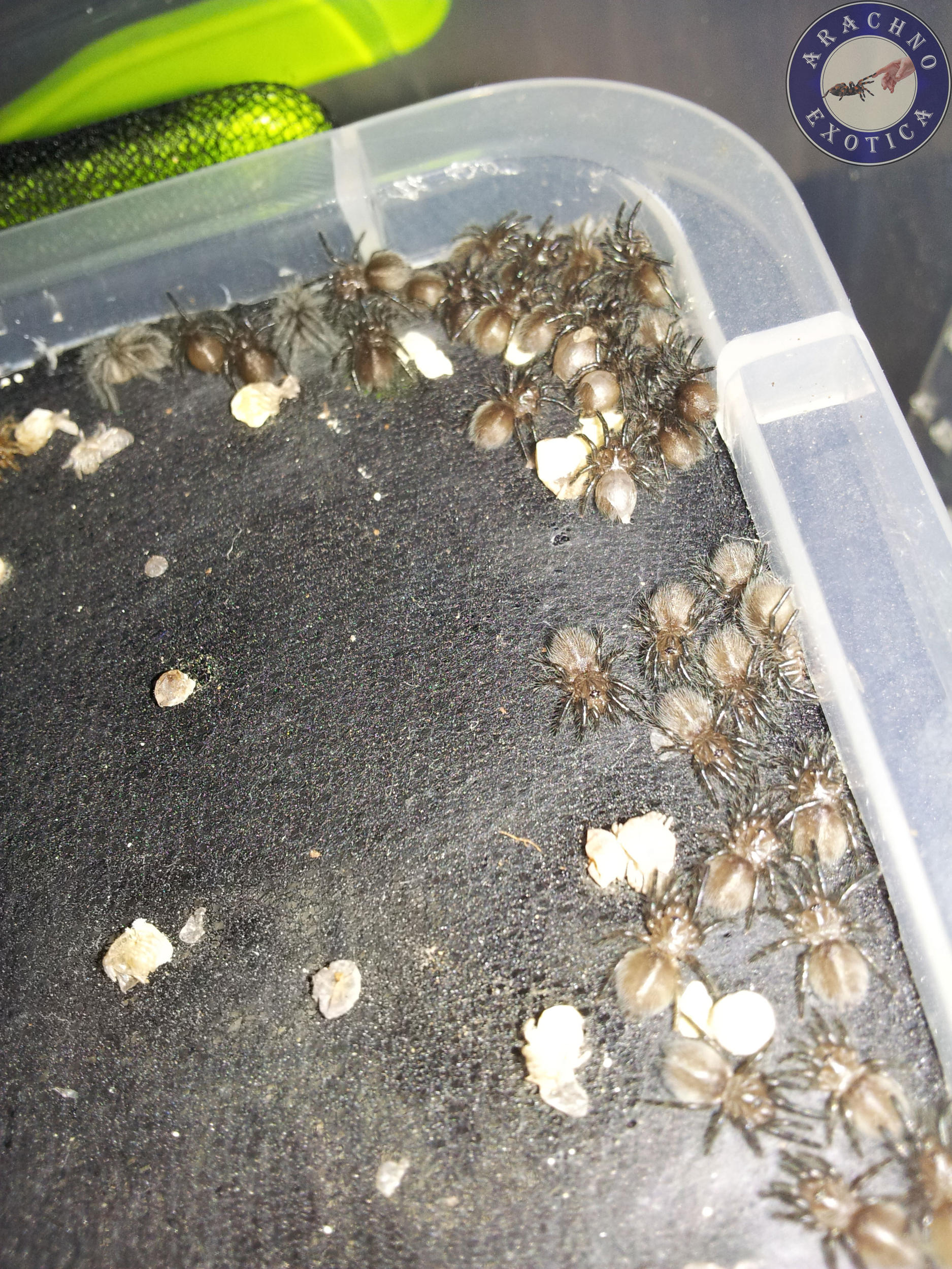 Через несколько дней был сплетен приличных размеров кокон, казалось даже, что мамаше довольно проблематично его перемещать из-за немалых размеров оного. Забрал кокон я на 31 день, внутри уже были нимфы 2 стадии, без отхода, всё это дело я рассыпал в инкубатор. В этот раз за период инкубирования были небольшие скачки с температурой 24-29 градусов, и влажностью (по показаниям китайского прибора) 80-95%. В процессе инкубирования наблюдался небольшой падеж, из-за чего салфетка, на которой сидели нимфы заплесневала, так что пришлось её сменить. По итогу в первую линьку вышло аж 1087 бодрых малыша, отход составил 46 штук. На данный момент, по количеству выхода мелочи, это моё самое масштабное разведение! Практически все паучки уже распроданы, осталось совсем малое количество.