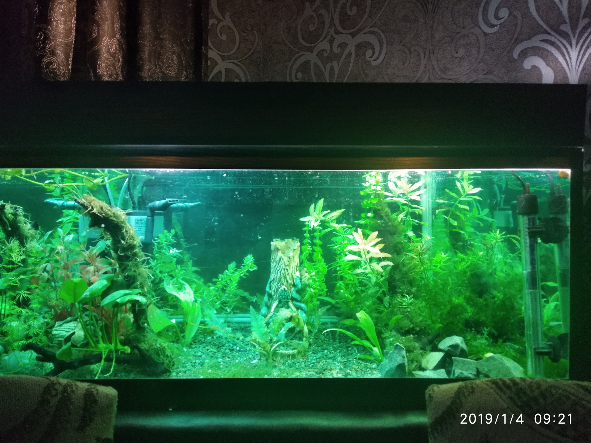Из растений сразу же были посажены Гигрофила многосеменная, Бакопа каролинская, Людвигия бревипес, Ротала индийская круглолистая, Линдерния круглолистая, Криптокарина Венде, Эхинодорус амазонский и эхинодорус горизонтальный. На левой коряге закреплен Анубиас и яванский мох, на правой Папоротник таиландский и мох феникс. Также к камням закрепил ломариопсис. Картина на сегодня на фото 4.