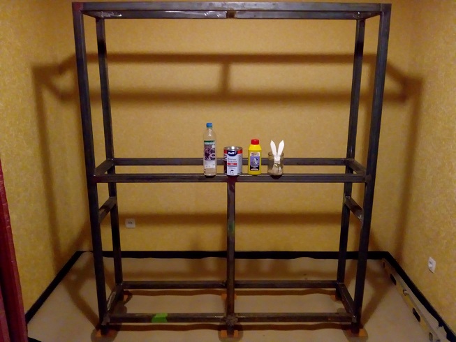 Спасибо, уважаемые коллеги, за годные советы. Я Вас послушал, сделал почти по-вашуму, но чуток по-своему. Заказал сварной стеллаж 1800*1500*400 из трубы 40*40*2 на металлобазе недалеко от дома, у них есть цех сварки металлоконструкций. Что-то гаражному сварщику я побоялся заказывать. Стойка даже без ОСБ и пеноплекса получилась золотой - 4000грн с доставкой и заносом. Однако, покрывая металл преобразователем ржавчины, результатом я остался доволен. Плоскости полок практически параллельны, выставить горизонт удалось прокладками 1.5мм (гетинакс завалявшийся), швы и рёбра зачищены, трубы не погнуты, стеллаж не шатается - ровно стоит на своих шести ногах. Прошу прощения за качество, снимал на телефон. Если кому будет интересна та или иная деталь - завтра перефотографирую на фотоаппарат (заряжаются аккумуляторы).